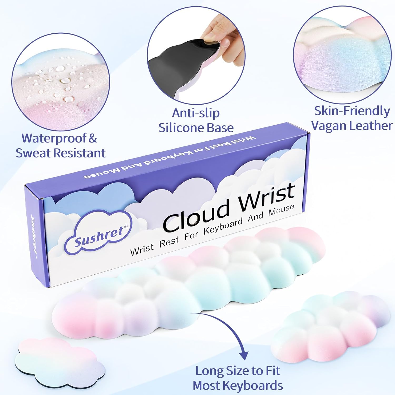 - Waterproof and Anti-slip: Made of water-resistant and sweat-proof vegan leather, easy to clean. The anti-slip base is made of silicone, which is non-toxic, chemical-free and safe to use. Provides a firm grip to keep the keyboard wrist rest firmly fixed on your desk. This keyboard cloud wrist rest can help you relax while studying, working or playing games