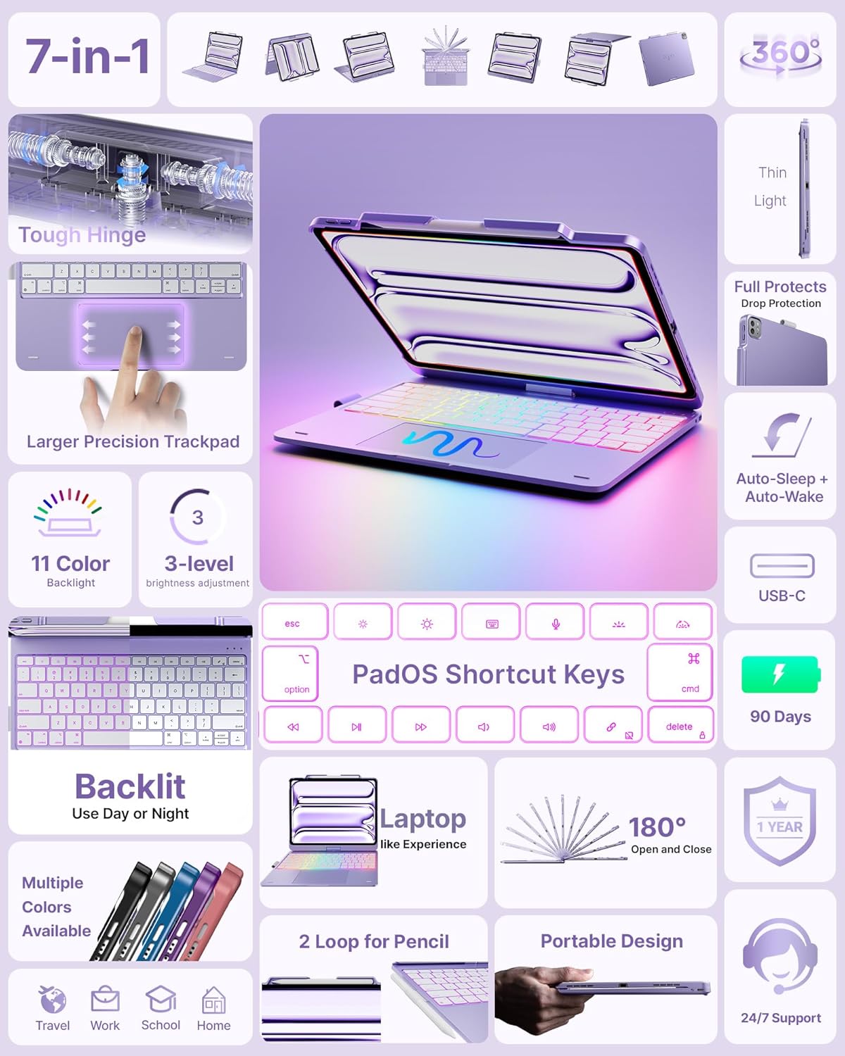 - 11-Color Backlit: 11-color backlit keyboard on this iPad 13 Pro case with keyboard allows brightness adjustment for excellent typing in any light; Includes full set of PadOS multimedia shortcuts for easy volume and music control.