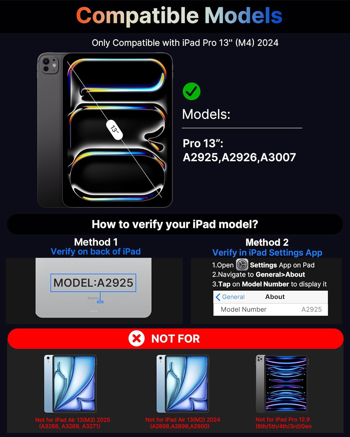 - ๐๐ผ๐บ๐ฝ๐ฎ๐๐ถ๐ฏ๐ถ๐น๐ถ๐๐:Elevate your iPad Pro 13 inch (M4) 2024 experience with our versatile keyboard case. Models include A2925,A2926,A3007. Due to the different arrangement of the magnets, this magic keyboard case is not compatible with other iPad models.If you're unsure about compatibility, feel free to reach outโwe're happy to help!