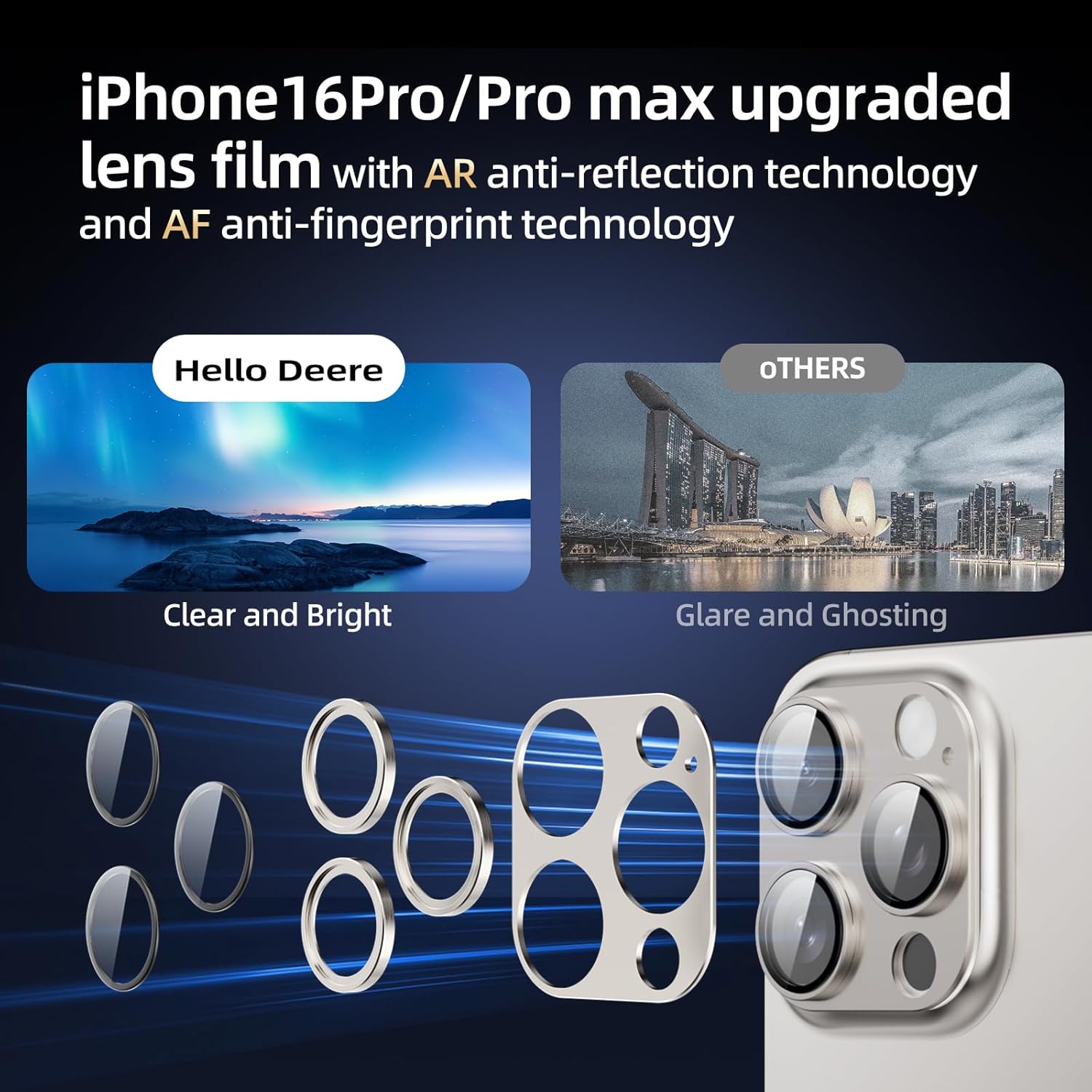 - 🥇【4th Gen Upgraded Camera Lens Protection】: HelloDeere for iPhone 16 Pro camera lens protector has been upgraded to the 4th generation Premium edition, the first in the quality field, with upgraded aluminum alloy and electroplated sapphire superhard AF film camera lens protective film, Effective anti-drop, dust-proof, anti-fingerprint, anti-scratch, enhance durability