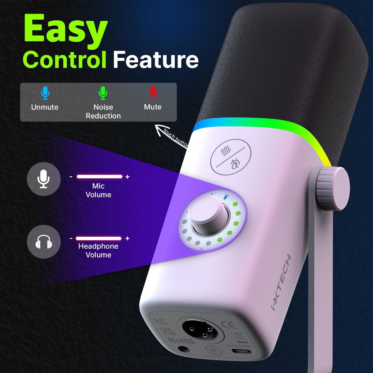 IXTECH Gaming USB Microphone for PC, Noise Cancellation Condenser Mic for Podcasts and Video Streaming with Tripod Stand, Pop Filter, Shock Mount, Gain Control, RGB Lights, Quiet Mute Button (White)