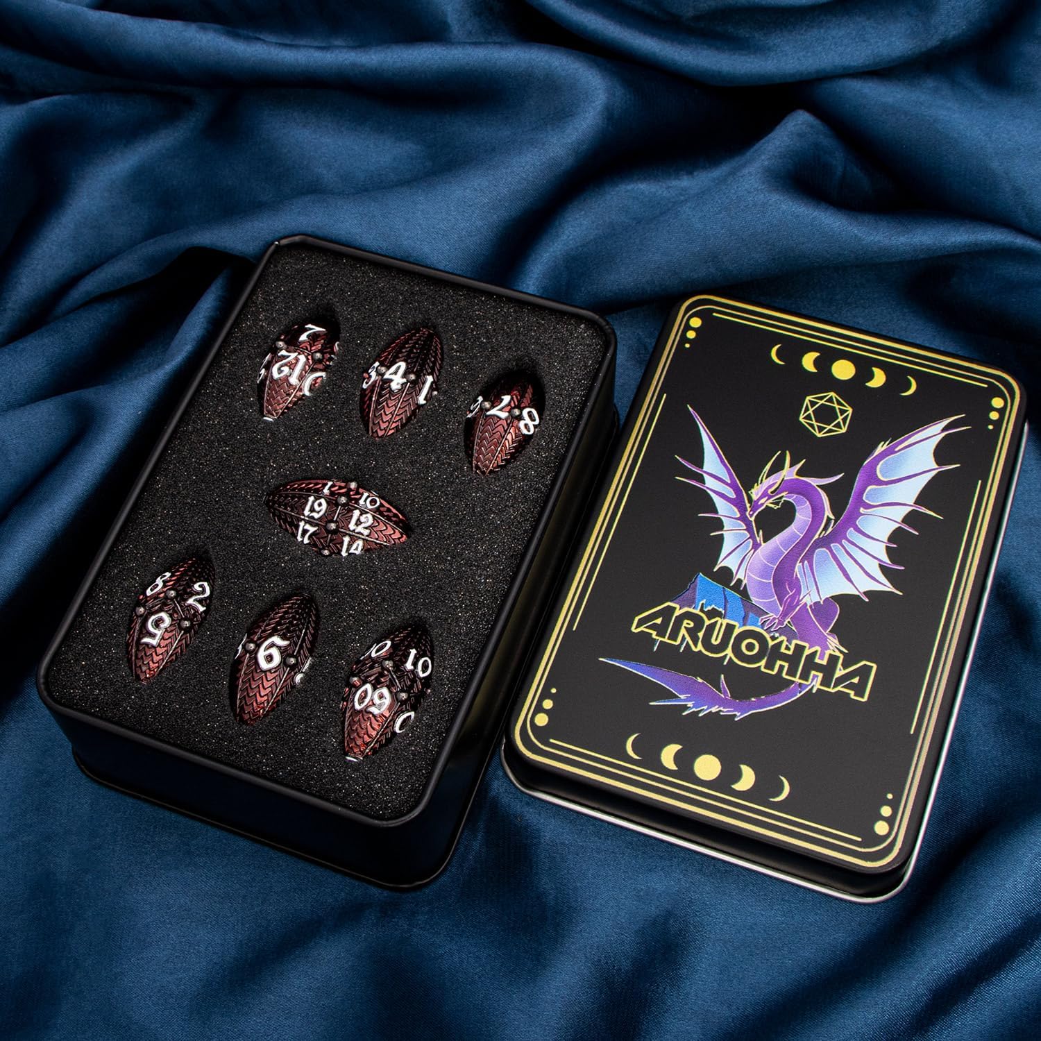 ARUOHHA DND Metal Dice Black Red Dragon Egg Dice with Metal Box, Role Playing Game RPG Polyhedral D and D Dice Set D20 D12 D10 D8 D6 D4