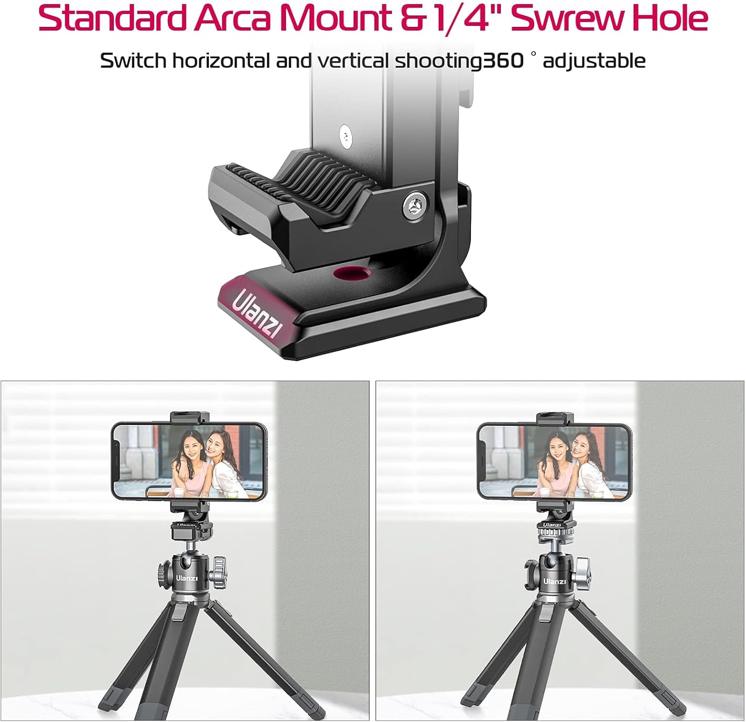 - 【Standard Arca Mount Base】The ULANZI phone holder for tripod includes a standard Arca-type quick release plate for fast setup. It also has a 1/4" screw port at the bottom for connecting to tripods.Built from solid aluminum metal, it's durable and safe