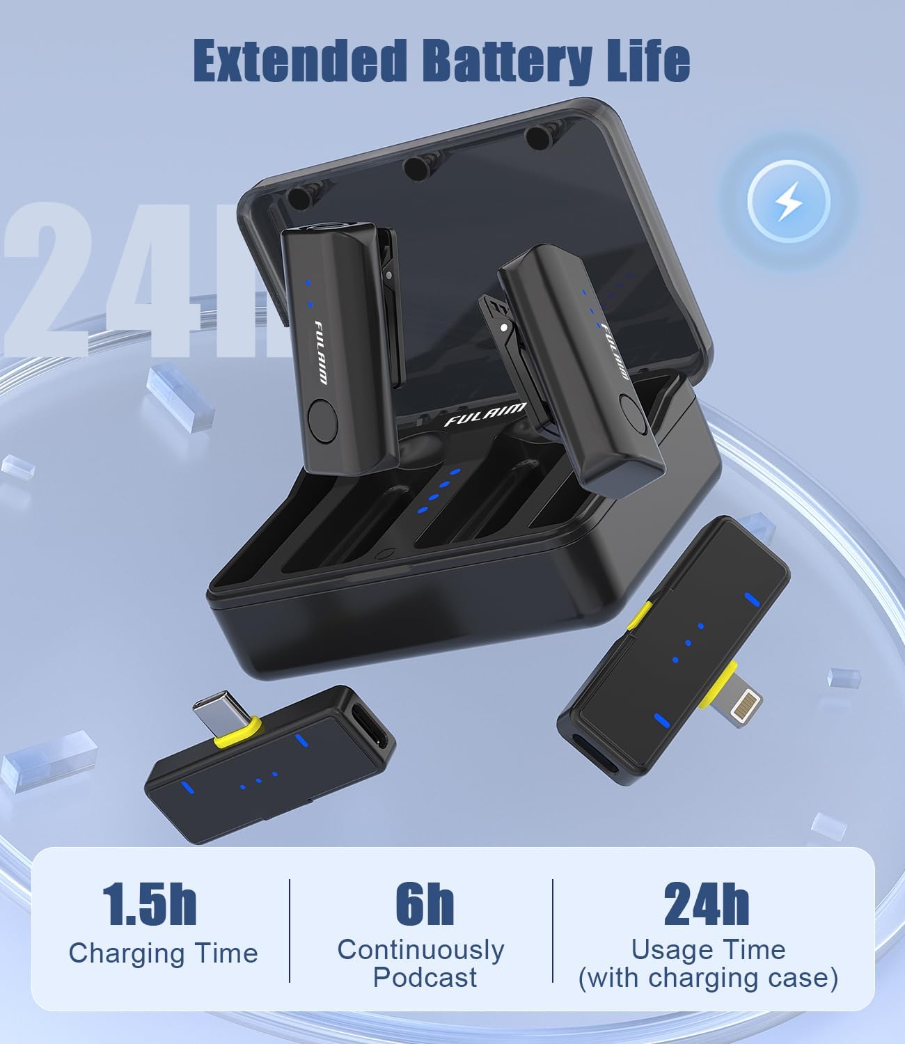 - 24-Hour Battery: Say goodbye to battery anxiety. With a charging case included, this microphone kit can be charged up to 3 times, providing up to 24 hours of usage time. Whether you're livestreaming or making Interview in remote locations with fewer charging options, this mic has got your back.