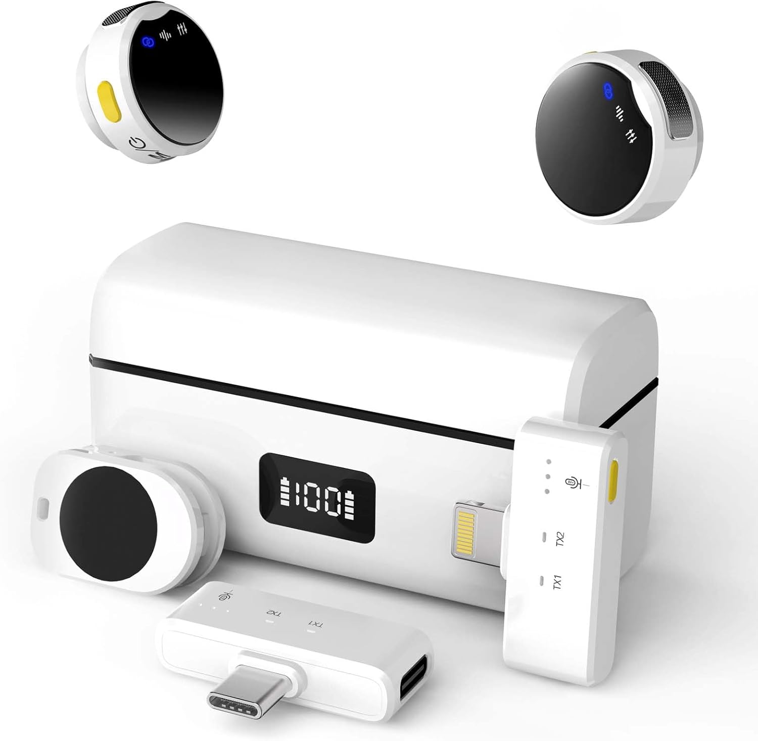 - Included Components : 1*Charging Cable, 1*Charging Case, 2*Microphone Receivers ( Lightning/Type-C), 2*Microphone Transmitters & 2*Furry Windshield, Other Accessories 1*Charging Cable, 1*Charging Case, 2*Microphone Receivers ( Lightning/Type-C), 2*Microphone Transmitters & 2*Furry Windshield, Other Accessories