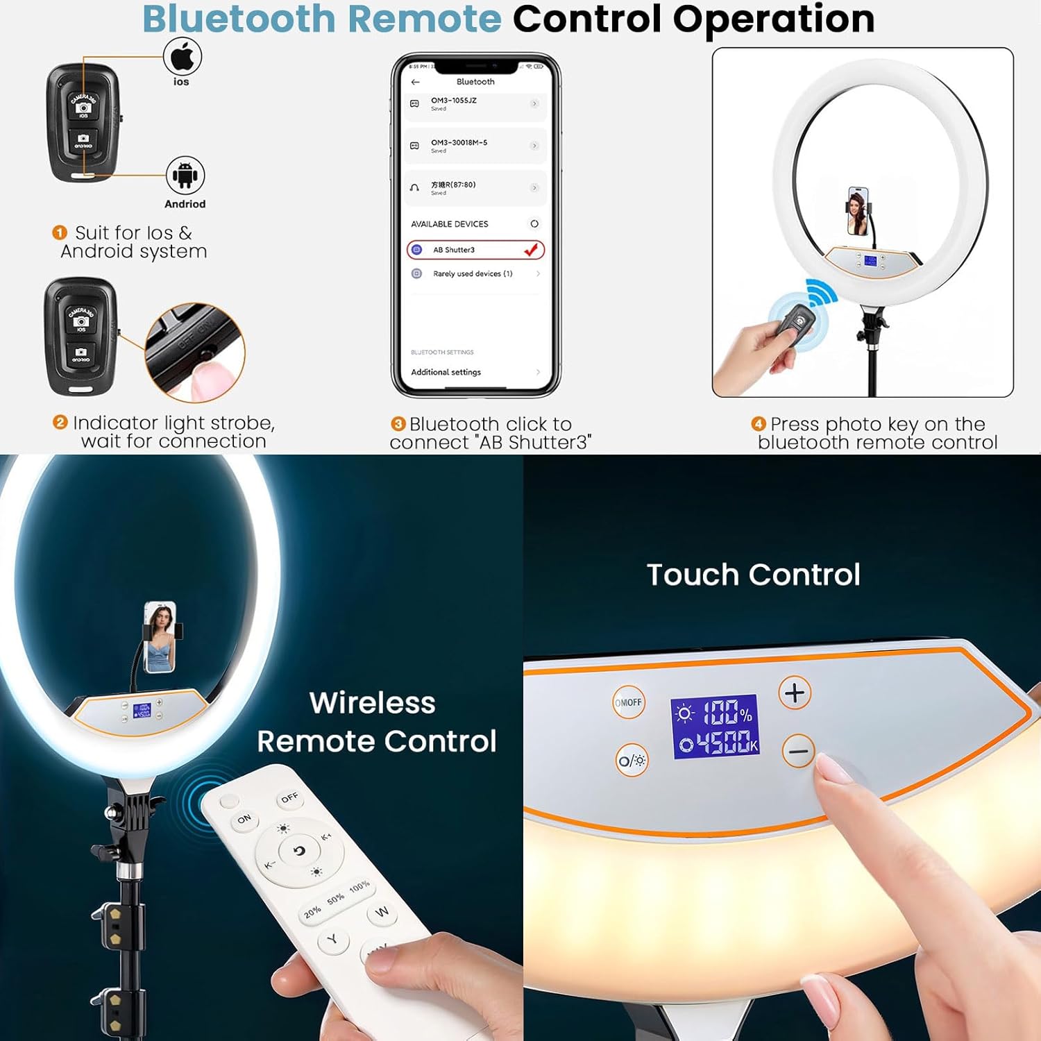 - 【Two Optional Control Ways】Two optional ways to adjust our ring light. One is manual touch control that you can easily rapid switch lighting color mode in nearby. Another is remote control for far distance (About 10meter) and it is convenient access to brightness, color temperature and scene lighting settings. This will ensure you to have the best pictures and videos with the most suitable distance and brightness.