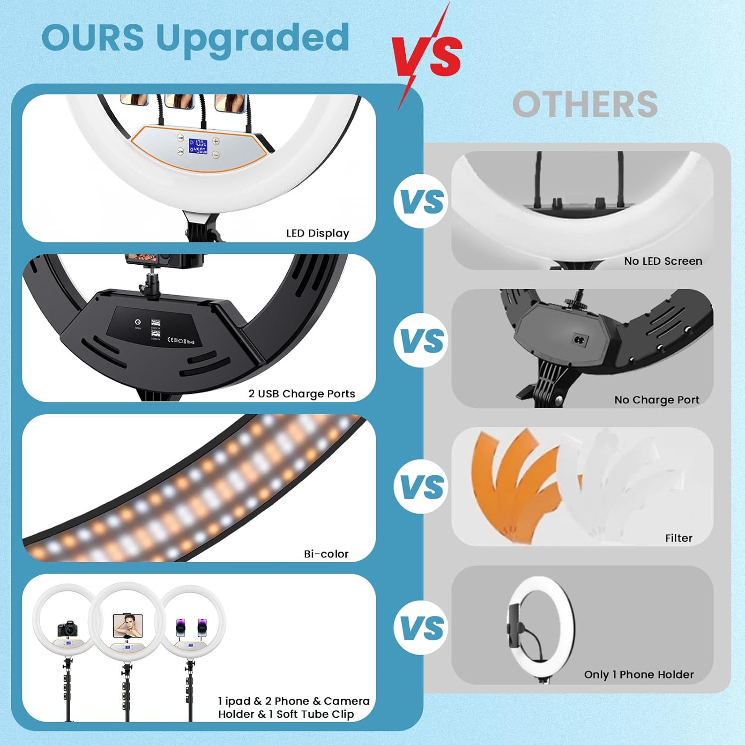 - 【Package & Brand Service】Package includes: 18-inch LED Ring Light*1, Tripod*1, Phone Holder*2, Super Phone Holder*1, Soft Tube*1,1/4 Ball Head*1, Bluetooth Shutter*1,Remote Controller*1,Power Cord*1,Carry Bag*1. We've got your back with a 1-year replacement service and lifetime-friendly after-sales support. If any issues, just hit us up via the "Contact Seller" button in Your Orders, and we'll sort you out within 24 hours.