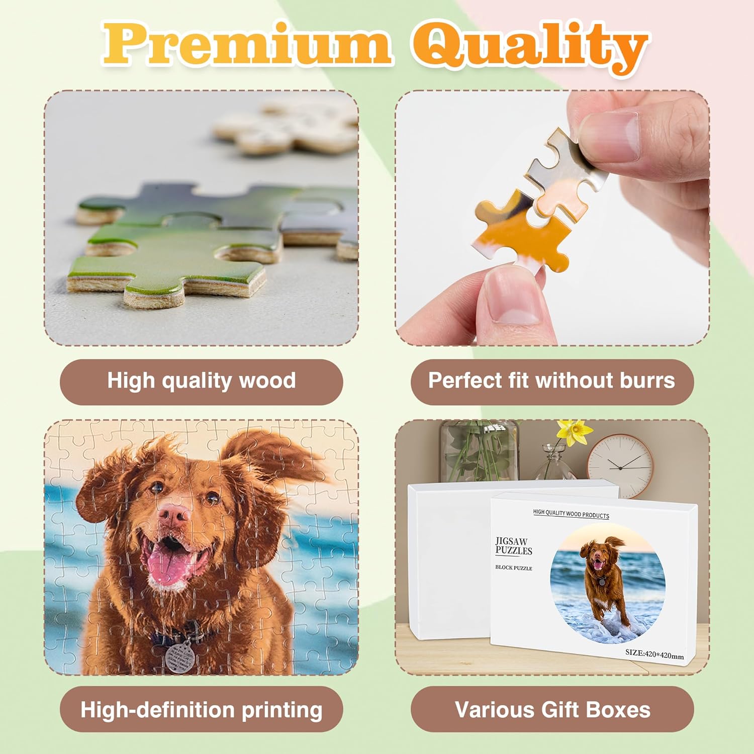 - 🧩Premium Material&Gift Package:!🕊️This picture jigsaw puzzle pieces fit together perfectly, made from natural wood, these puzzles are super smooth, eco-friendly, and totally safe—no splinters here! With super sharp UV printing, your photos pop with color and detail. Gift package is perfect for gifting or keeping the good vibes alive