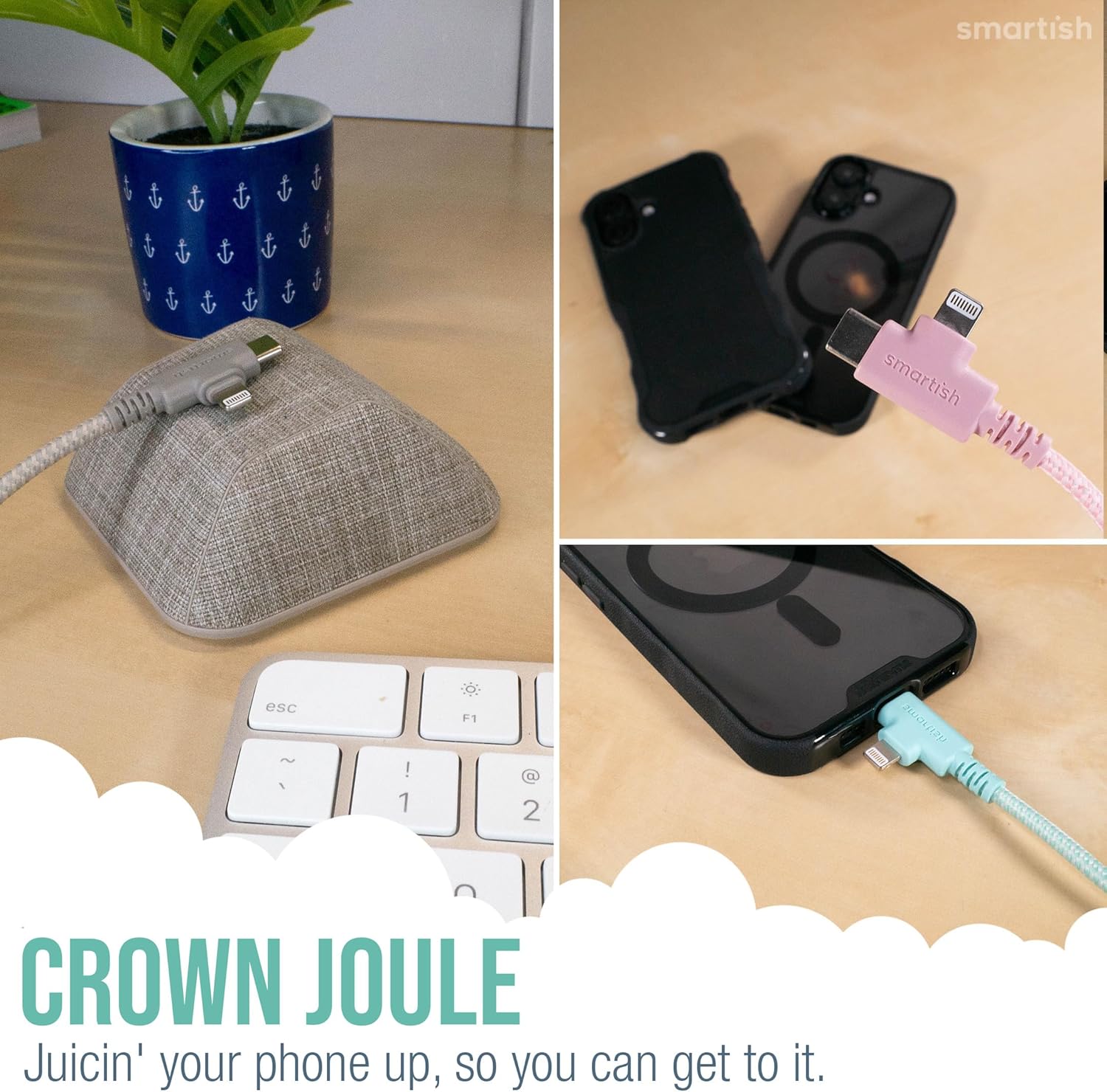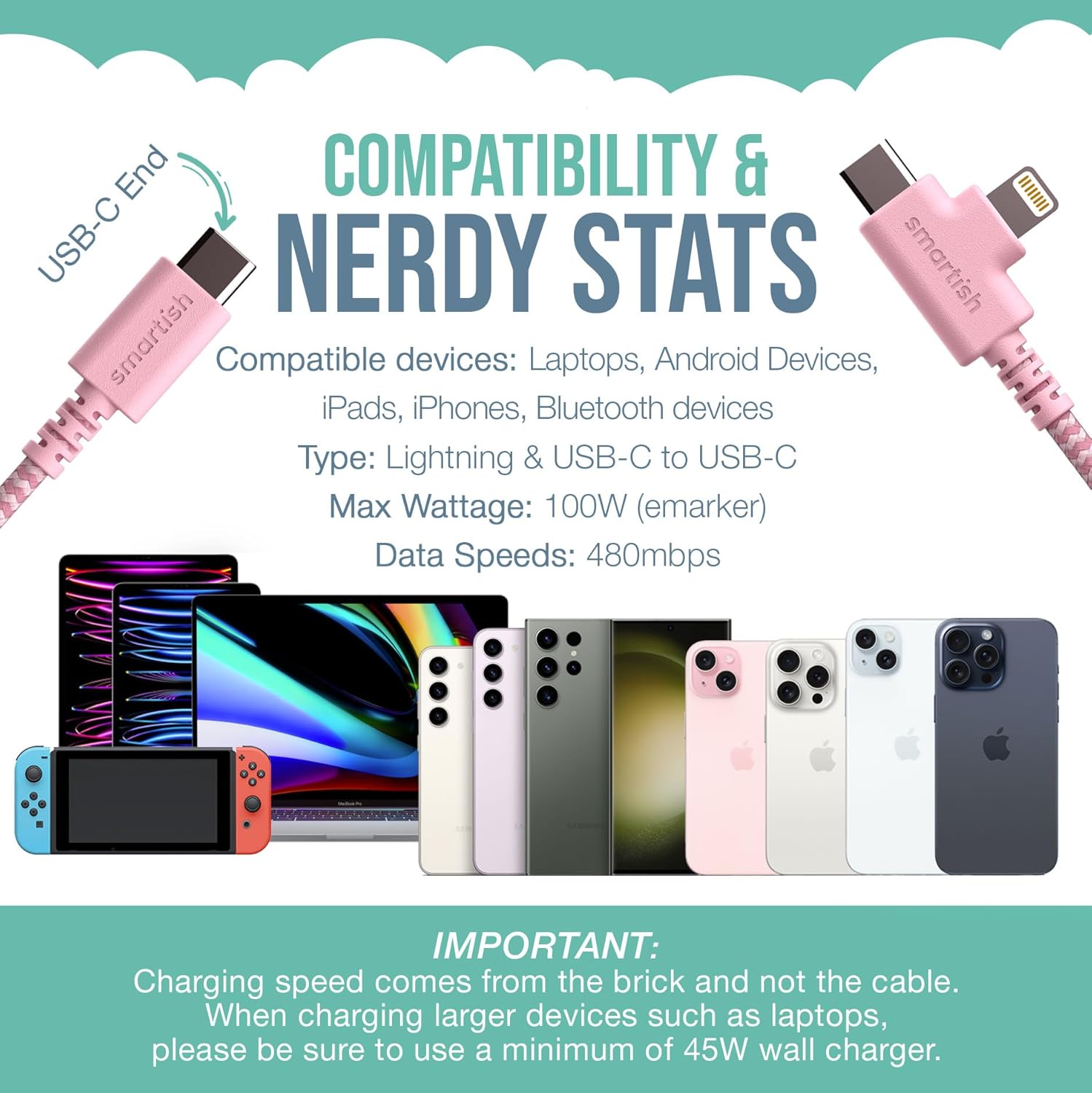 Smartish 2 in 1 USB C to USB C/Lightning Cable - Crown Joule - 6 Ft Fabric Wrapped Fast Charging Cord - for iPhone, Galaxy, Pixel - 100W Dual Fast Charger for Phones/Laptops - I'm Blushing