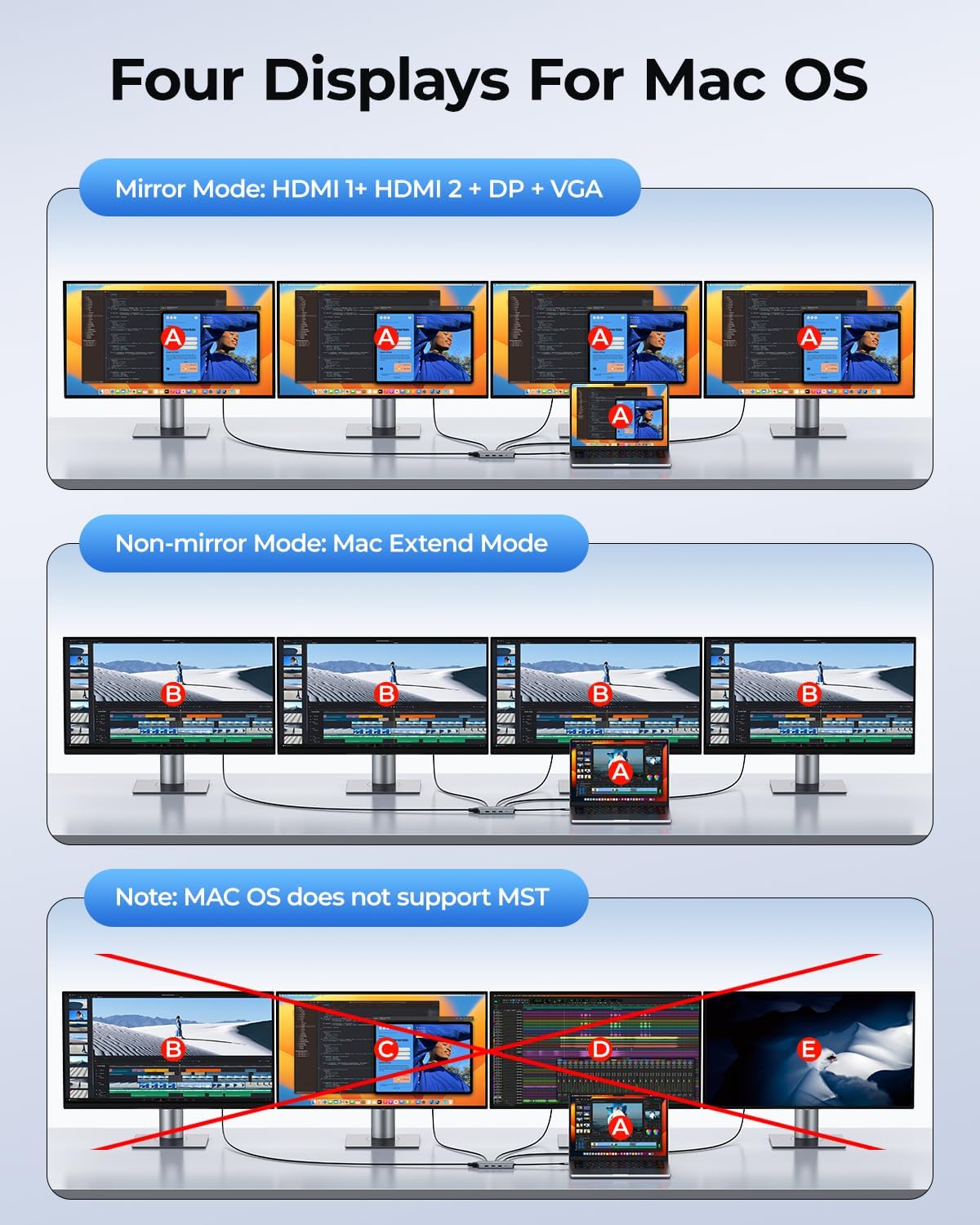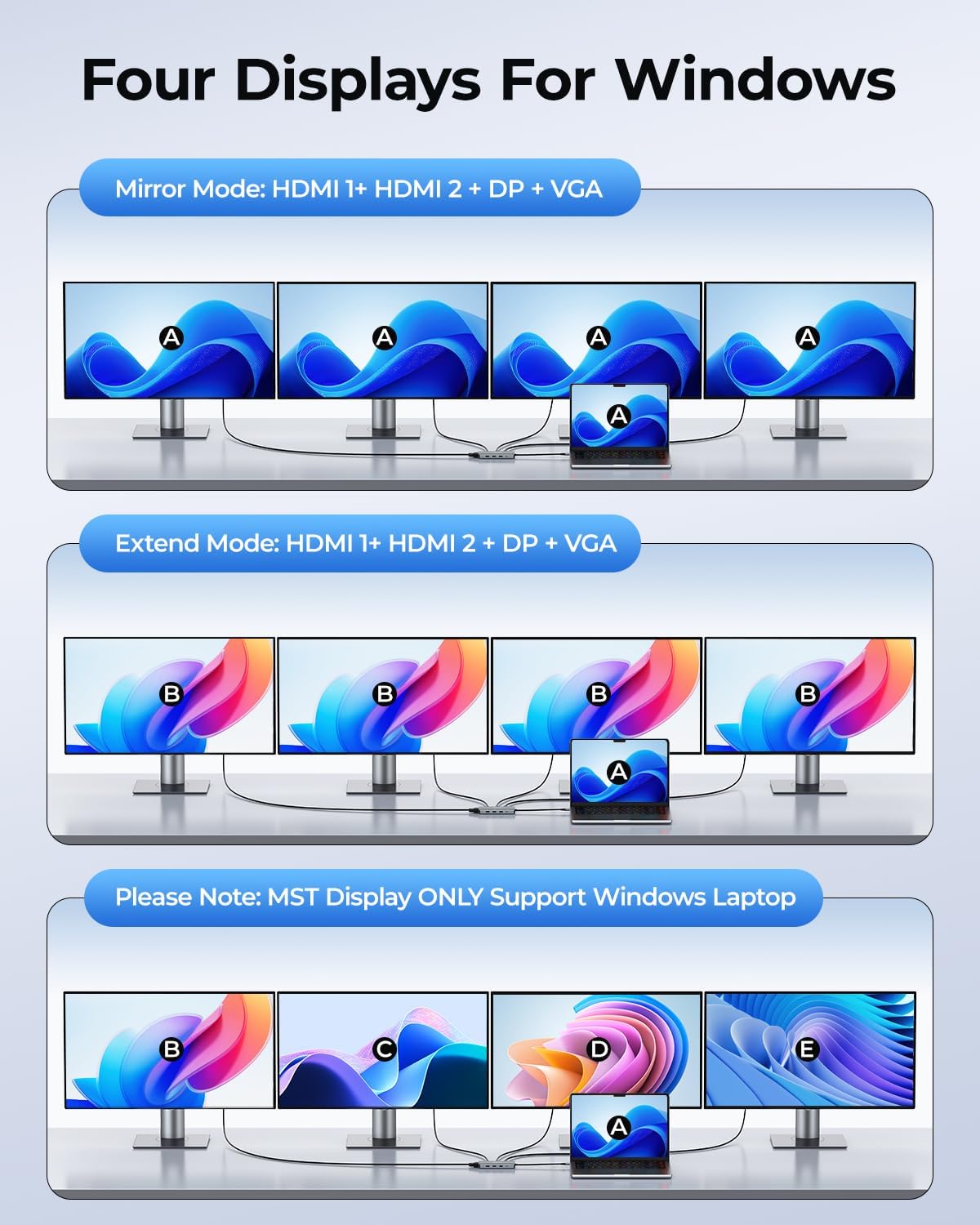- ăMax to Quadruple Display Docking StationăOur USB C Dock support up to four-screen display for Windows(A=B+C+D+E) and Mac OS(A=B+B+B+B). For quadruple display Dual HDMI, DP, and VGA all are 1080@60Hz.â„â„Please note:Only supports 4 screens in the same modeâ„â„