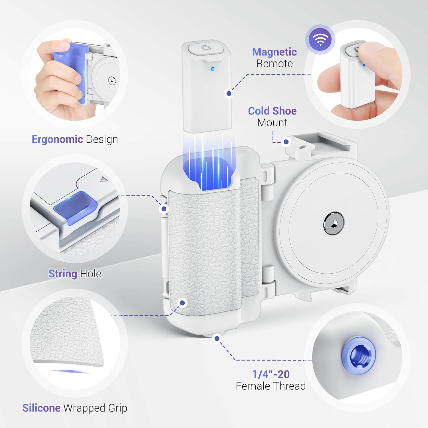 - Rechargeable & Detachable Bluetooth Shutter: Say goodbye to awkward selfies and group shots! The grip comes with a detachable wireless remote control compatible with most smartphones. It allows you to snap photos or start/stop video recording up to 32.8 feet away! The shutter features a built-in battery that's easily rechargeable using the Type-C cable.