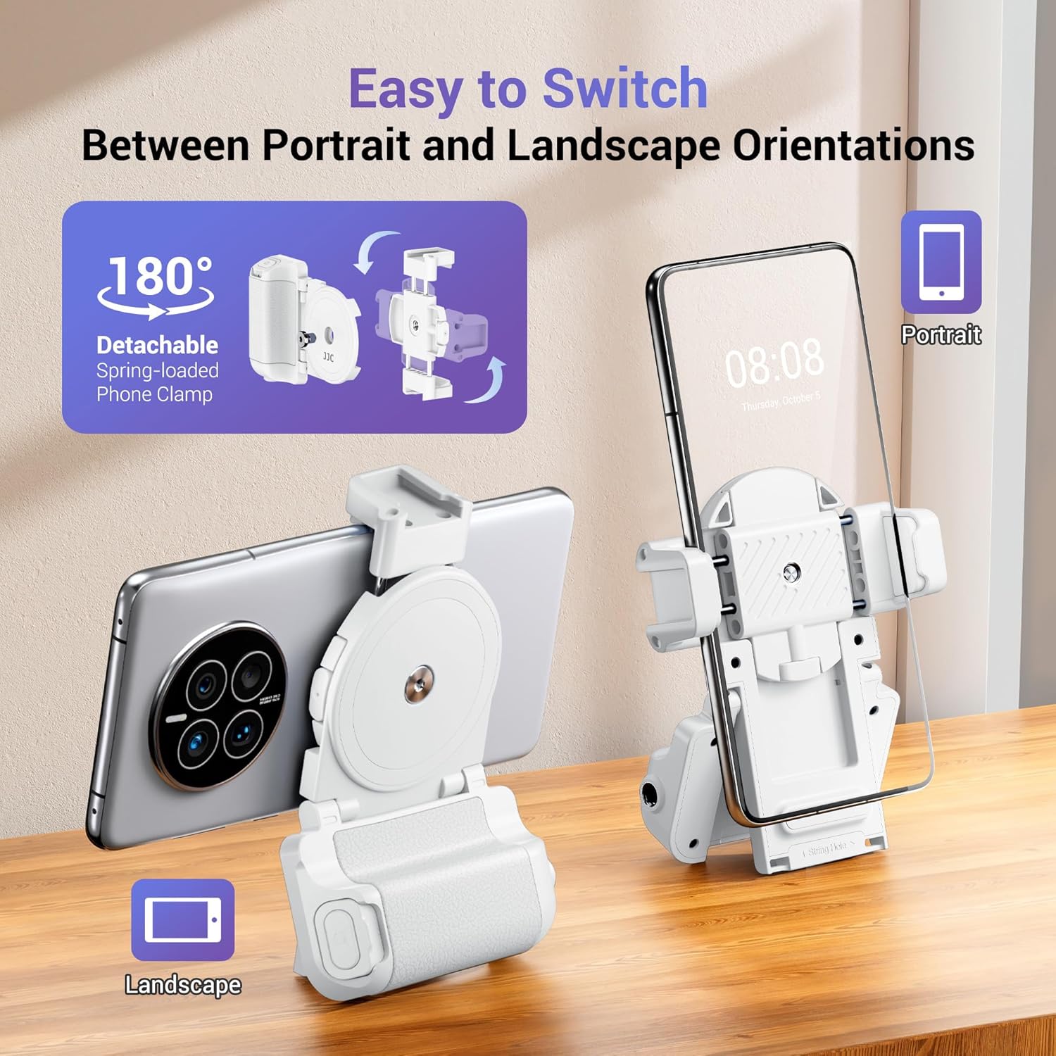 - Enhanced Versatility: The spring-loaded phone clamp supports horizontal and vertical setups and boasts dual cold shoe mounts, accommodating microphones and LED lights for expanded creative possibilities. The grip effortlessly spreads to function as a phone stand, giving you hands-free viewing in both portrait and landscape orientations. Perfect for binge-watching, video calls, or content consumption.