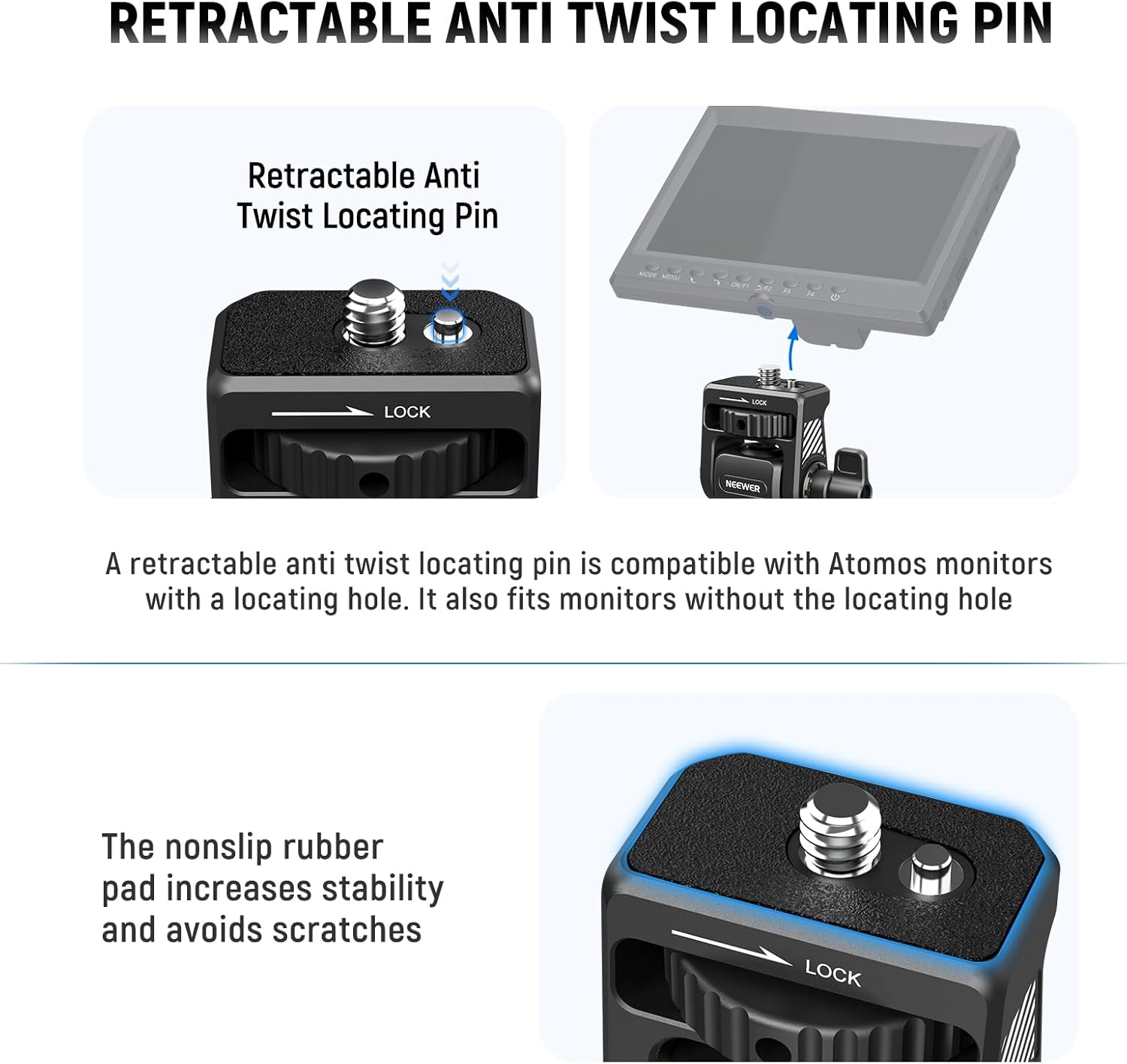 - 【Retractable Anti Twist Locating Pin】 A retractable anti twist locating pin is compatible with Atomos Ninja V Ninja V+ and other monitors with a locating hole, or NEEWER F100 F200 F400 Pro F500 monitors without a locating hole. The nonslip rubber pad adds stability and prevents scratches