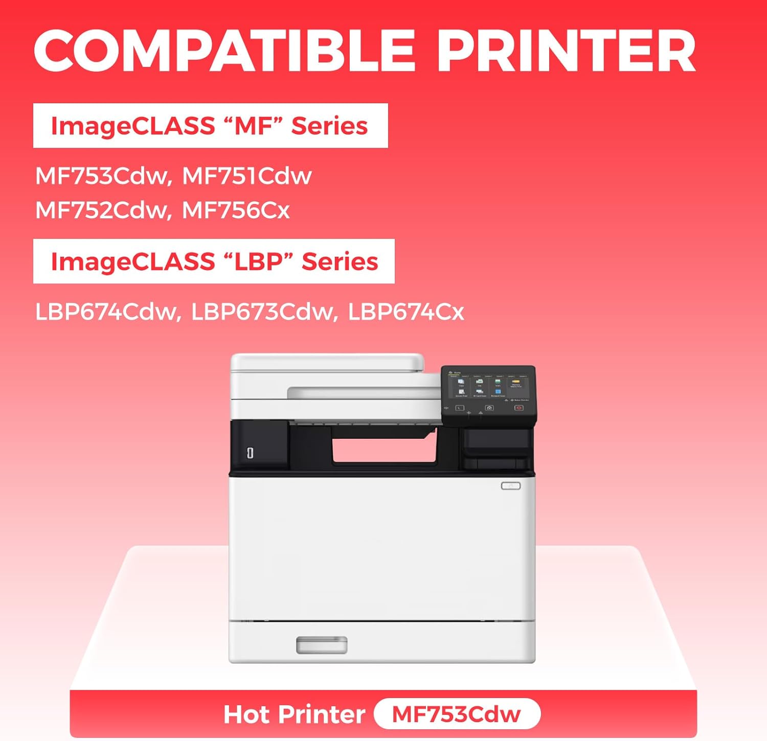 - Compatible Devices : Compatible with Canon ImageCLASS "MF"Series:MF753Cdw, MF751Cdw,MF752Cdw, MF756Cx ImageCLASS "LBP"Series:LBP674Cdw, LBP673Cdw, LBP674Cx Printer. Compatible with Canon ImageCLASS "MF"Series:MF753Cdw, MF751Cdw,MF752Cdw, MF756Cx ImageCLASS "LBP"Series:LBP674Cdw, LBP673Cdw, LBP674Cx Printer.