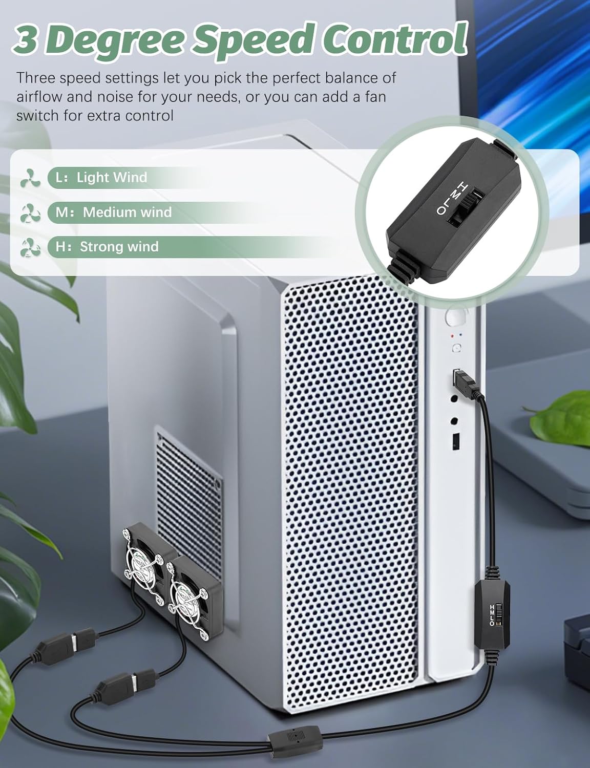 - Extensive accessories: The 5v 40mm fan includes a pair of USB fans, a 2-in-1 power cord for simultaneous control, and a protective iron mesh to keep your hands safe