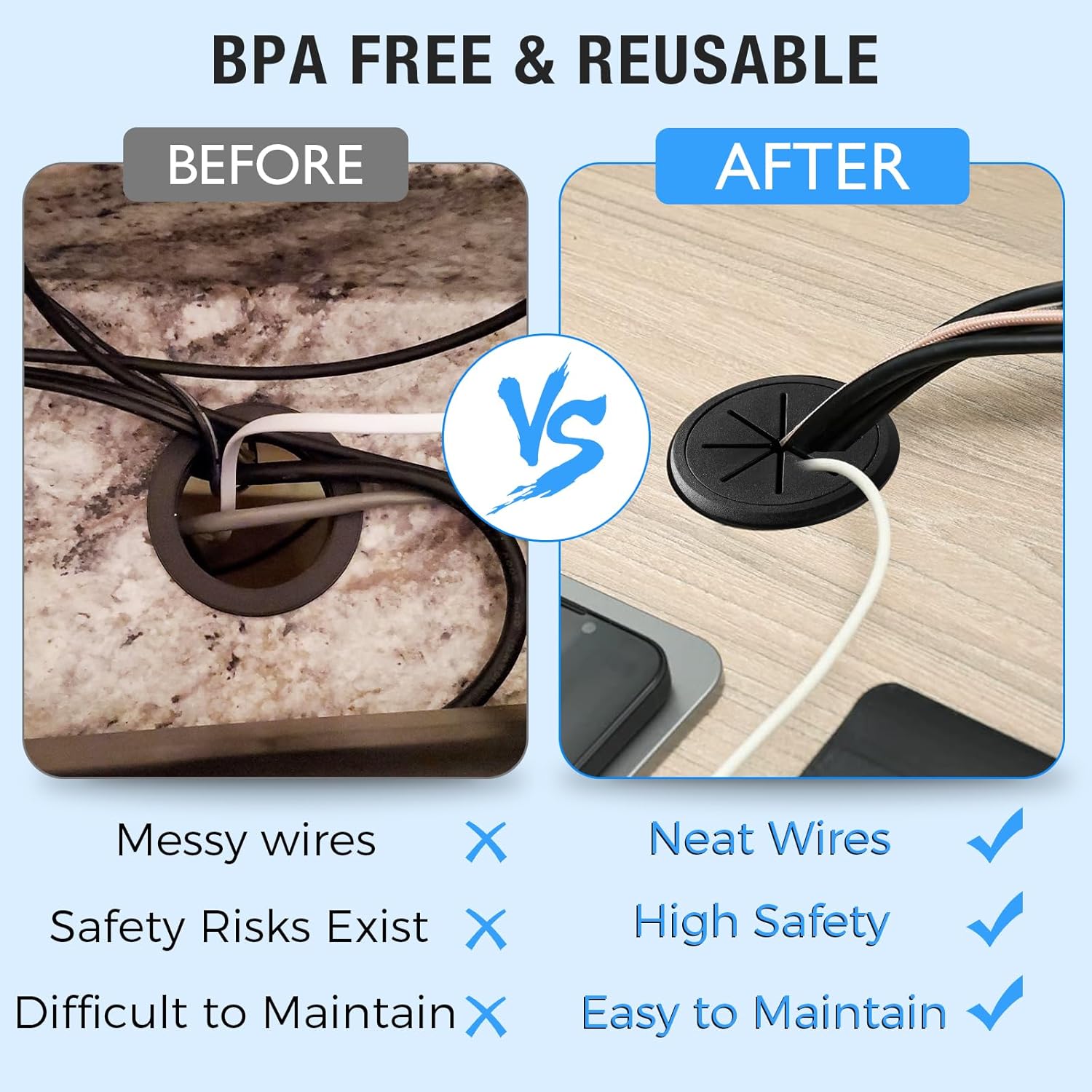 - Maintain Safety: The desk wire hole insert helps to organize cables on your desktop, keeping it tidy and improving productivity; Cable grommet smooth surface protects cables from sharp edges, reduces bending and pulling of cables, extends cable life and ensures a safe work area