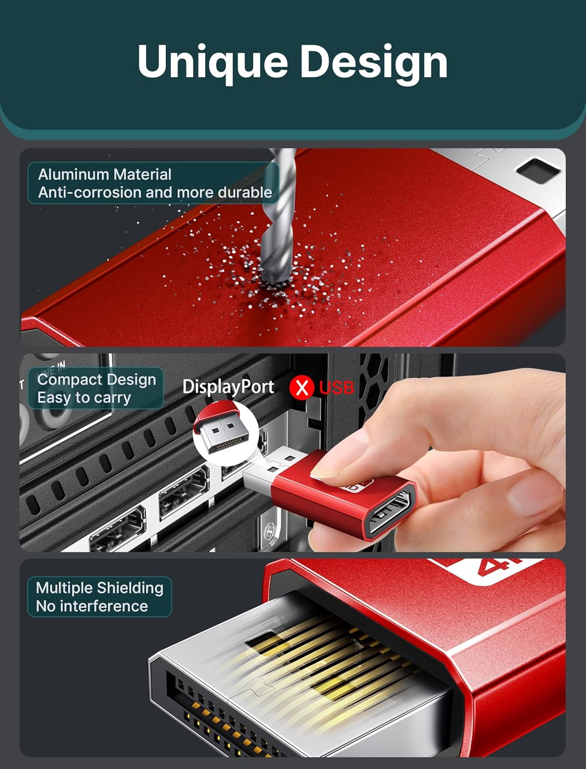 JSAUX 4K DisplayPort to HDMI Adapter 1Pack, DP PC to HDMI Monitor Converter Video UHD 2K@120Hz,4K@30 DP to HDTV Male to Female Uni-Directional Adapter Compatible with Dell, Lenovo, HP,GPU, AMD -Red