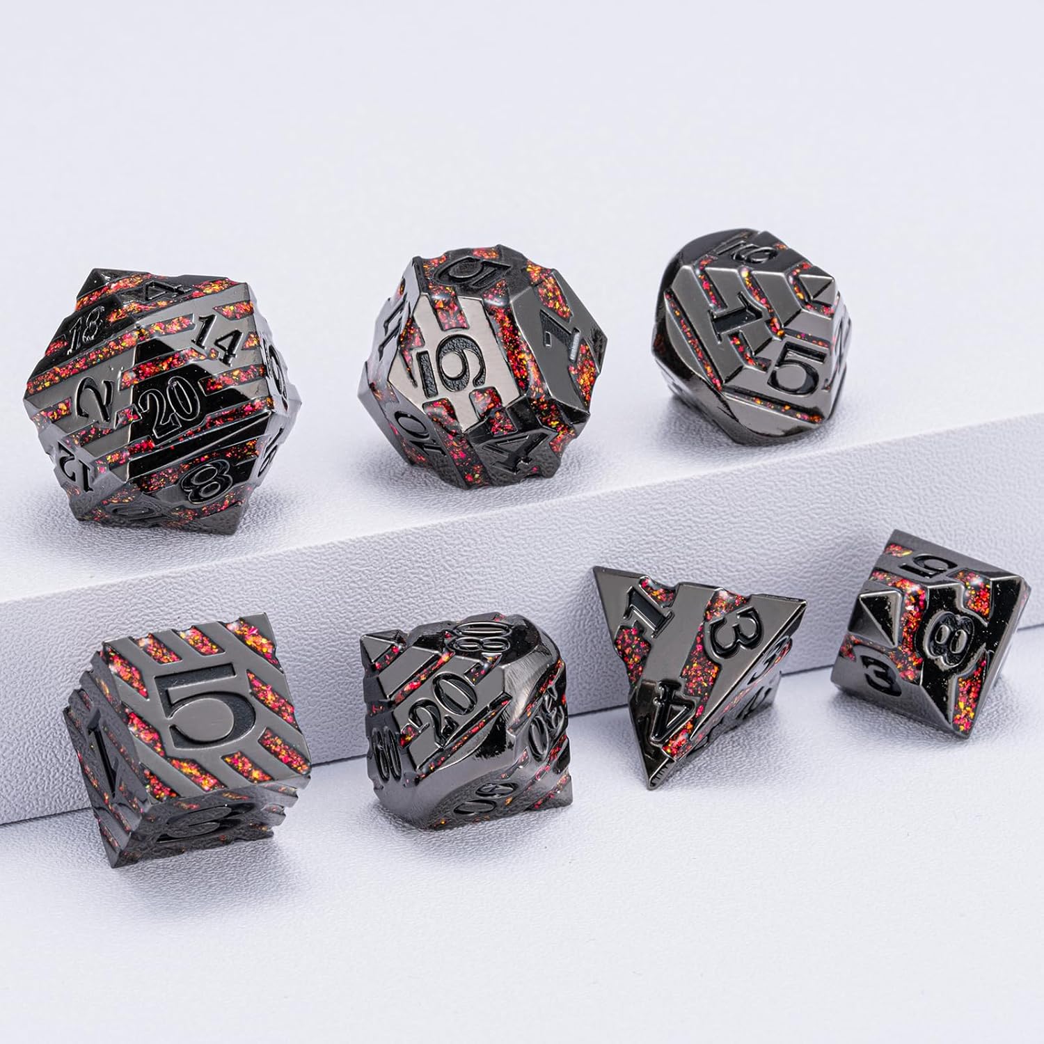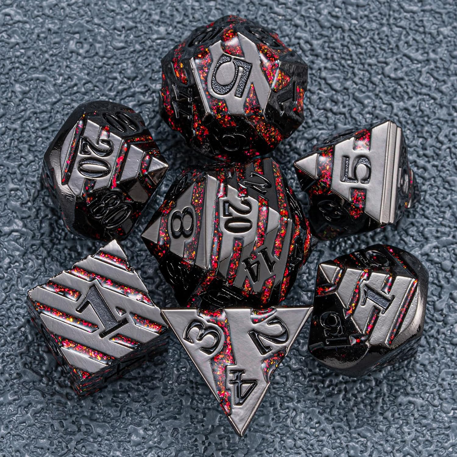 Metal Dice Set DND,Metallic Glitter Stripes D&D Dice Set,7 PCS Polyhedral Dice Set with Gift Case for Dungeons and Dragons Tabletop Game(Black Nickel Red)