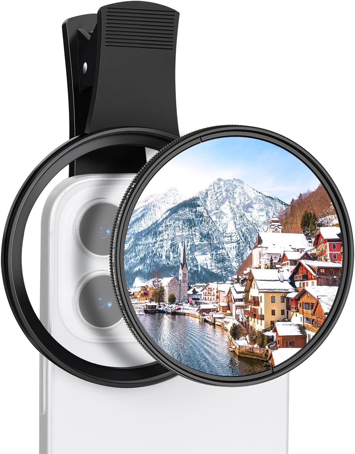 - Quick Install & Easy Operation: Simply screw the filter on the phone clip, then clamp it on your phone, rotate the filter to a desired stop according to the light condition and start taking photos. During a photo shoot, easily rotate the filter to adjust light exposure for different effects