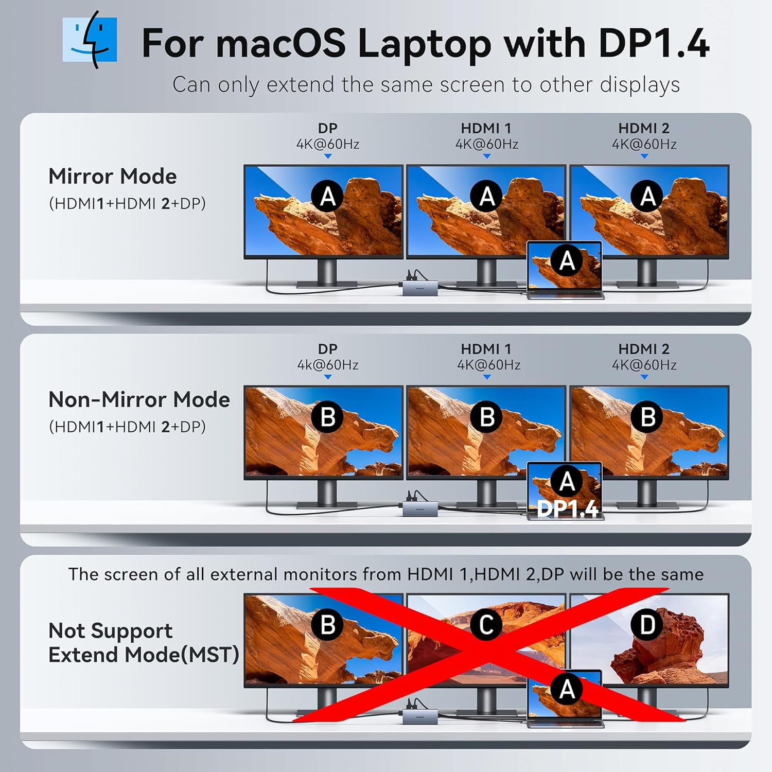 - 4K Dual Monitor&Triple Display: The docking Station dual monitor can easily to achieve dual-monitor and triple-monitor displays for Windows.Single use HDMI max up to 4K@60Hz,DP up to 8K@30Hz(DP1.4). When connect 2 displays,the resolution will be dual 4K@60Hz(DP1.4). Display output will be dual 4K@60Hz and 4K@30Hz when triple display(DP1.4) .When connecting 3 monitors and only two monitors are displayed,please plug in the DP port first,then plug in the 2 HDMI ports.Mac OS ONLY Support Mirror Mode