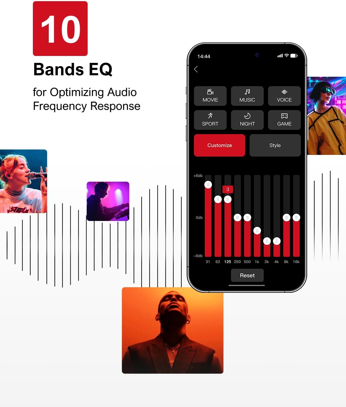 - 10-Band Equalizer Settings: Enhance your audio experience with 6 specially designed EQ modes: Movie, Music, Voice, Sport, Game, and Night, each optimized for superior sound performance. Take your listening further with the Ultimea App’s advanced "Customize" feature, which lets you fine-tune and create the ideal sound profile tailored to your personal taste and surroundings.