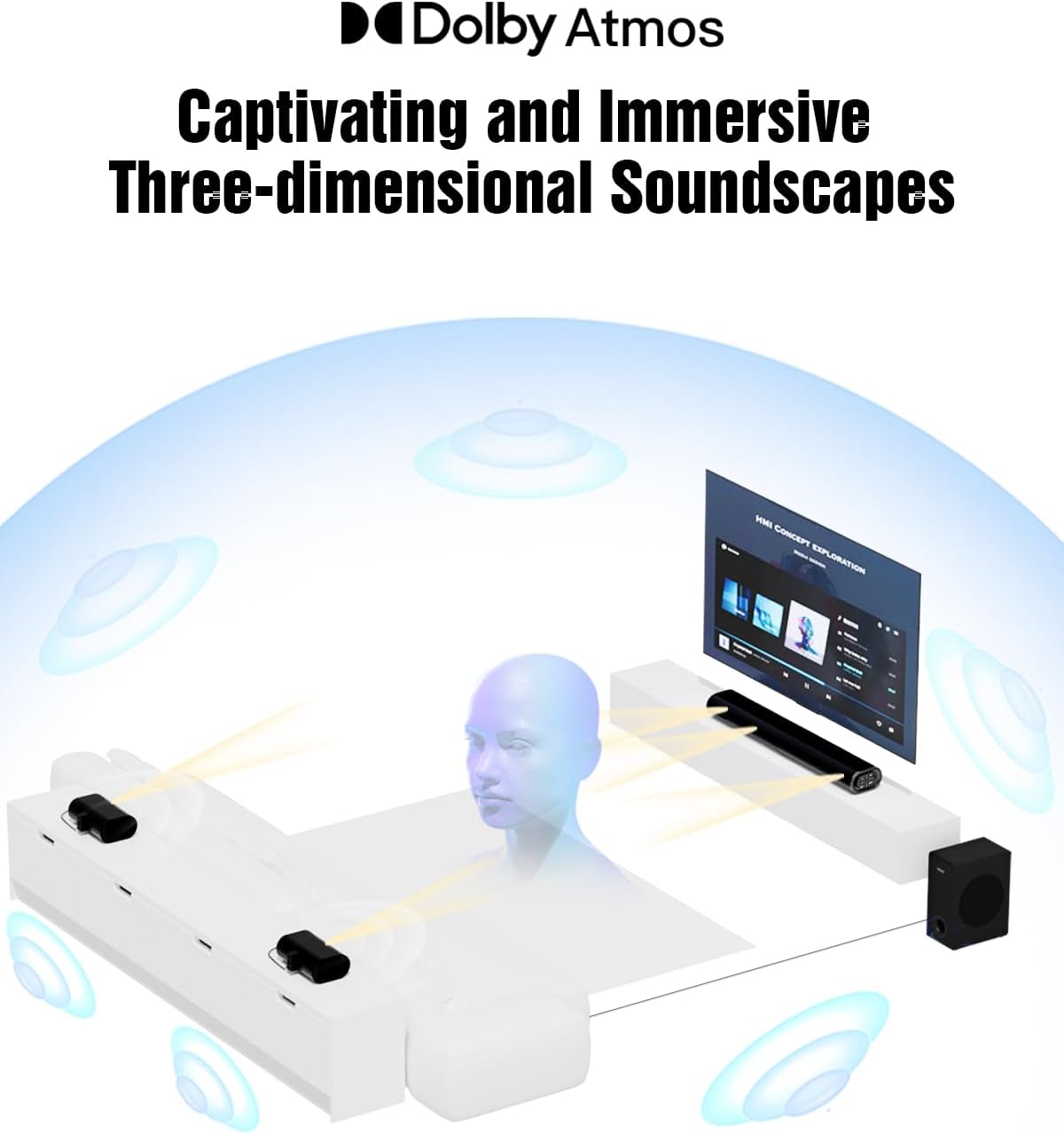 - Superior Dolby Atmos Surround System : Hiwill A51 tv sound system upgraded to dolby atmos which redefines dimensional audio, transforms your home entertainment into a theater-like experience, delivering lifelike audio that surrounds you in every direction. While a non-Dolby Atmos soundbar offers decent sound quality, it can’t match the depth, immersion, and realism that Dolby Atmos provides.
