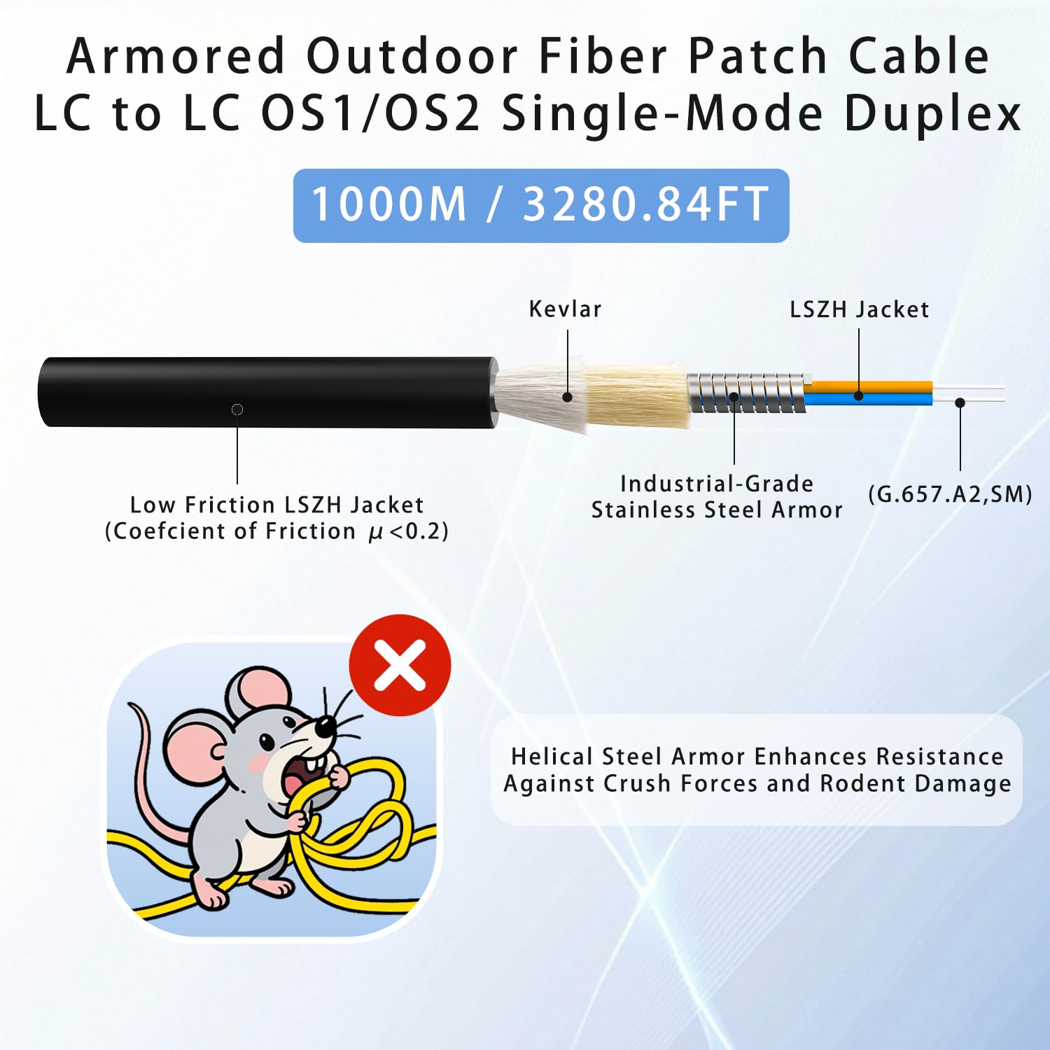 - 【Rugged Armored Outdoor Design】This 3281ft (1000M) single mode fiber optic cable features built-in stainless steel armor to resist crushing, moisture, rodent bites, and UV exposure. Perfect for harsh outdoor environments such as underground conduits, exterior building links, or industrial wiring.