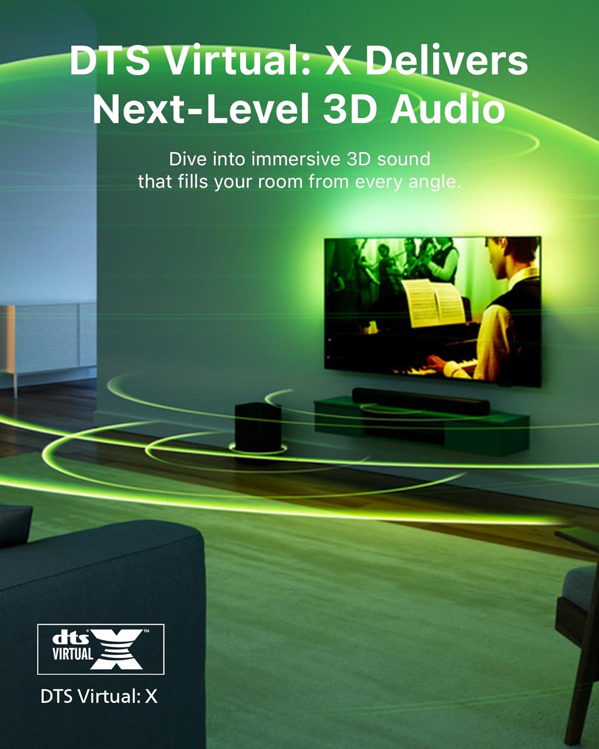 - 3D SOUND WITH DTS Virtual:X: Compatibility with DTS Virtual:X transforms your TV sound, bringing you a virtual 3D sound experience no matter what's on screen! You don't need extra speakers, and it works in any room: turn it on via the soundbar's remote control, or the PHILIPS Home Entertainment app.