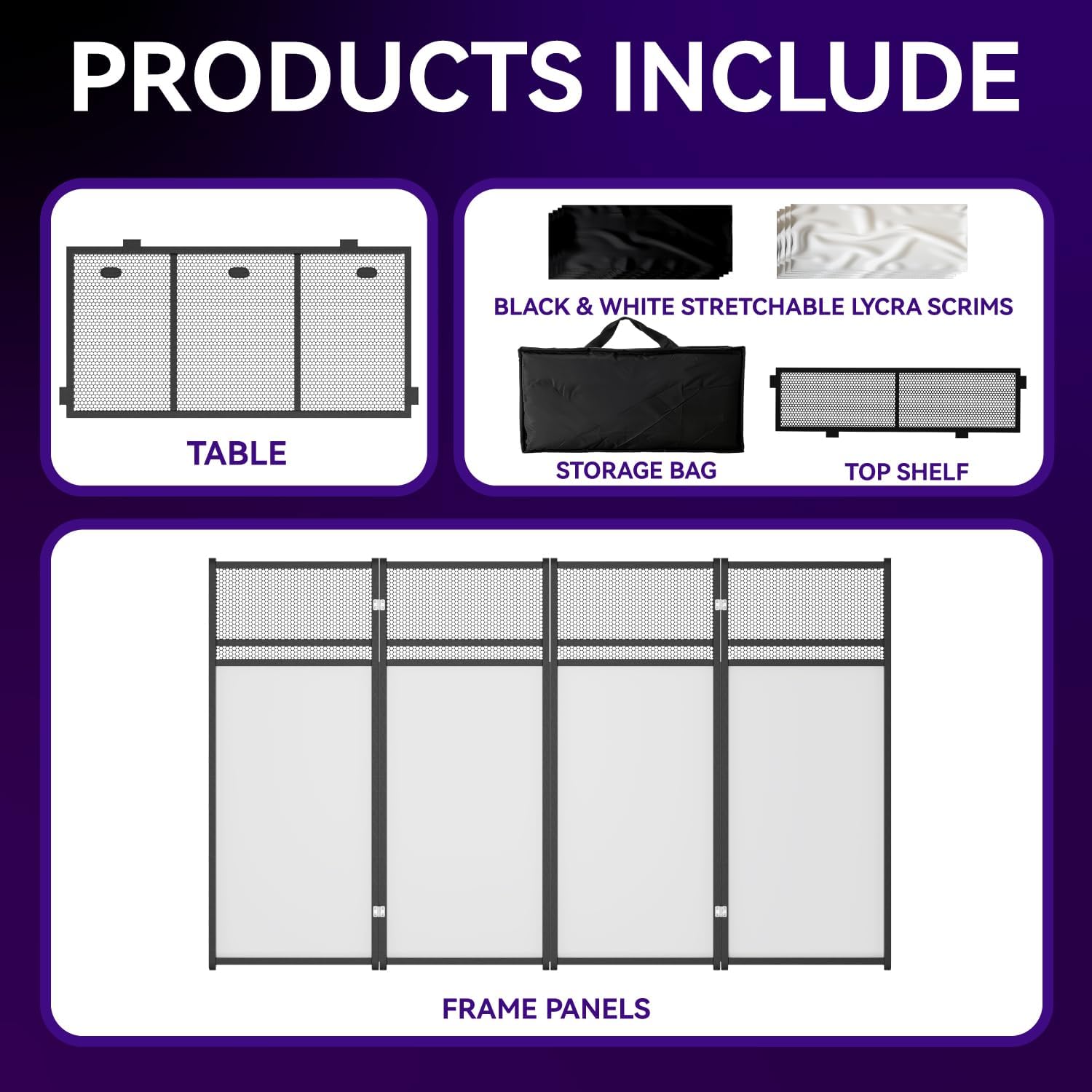 - 【Easy Installation & Foldable Design】The DJ stand facade can be almost completely folded flat for easy carrying. It consists of four folding panels and 2 desktop panels, which can be quickly installed and disassembled in just a few minutes without any tools. We also configure a carrying bag for you to carry and transport conveniently