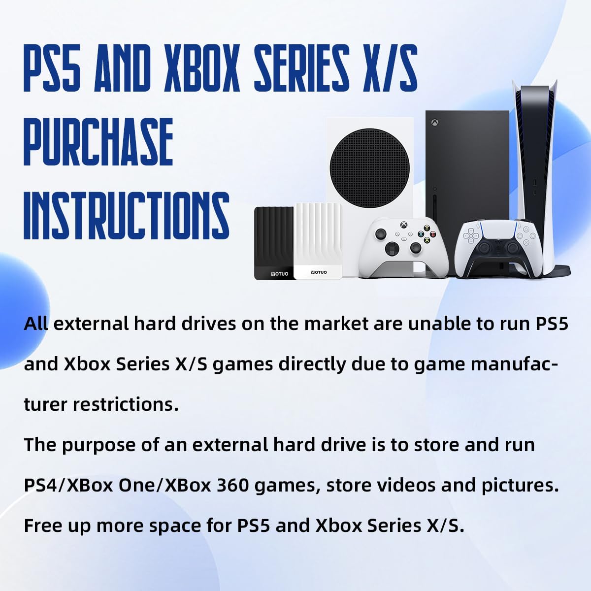 - 【Gaming device manufacturer restrictions for different generations of games】Due to restrictions imposed by gaming device manufacturers, the PS5 can read and run PS4 games directly from an external hard drive, but cannot run PS5 games directly from an external hard drive; PS5 games on the external hard drive need to be moved to the device in order to run. Similarly, the Xbox X Series and Xbox S Series can only run Xbox One games directly from an external hard drive.