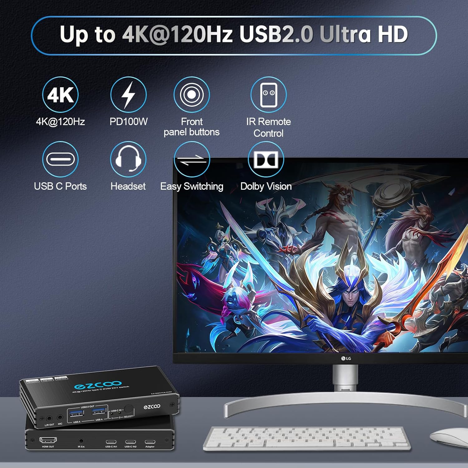 4K@120Hz USB-C HDMI2.1 KVM Switch for 2 Laptops with 2 USB 2.0 Ports L/R MIC Out Share 1 Monitors Keyboard Mouse Hard Drive Printer