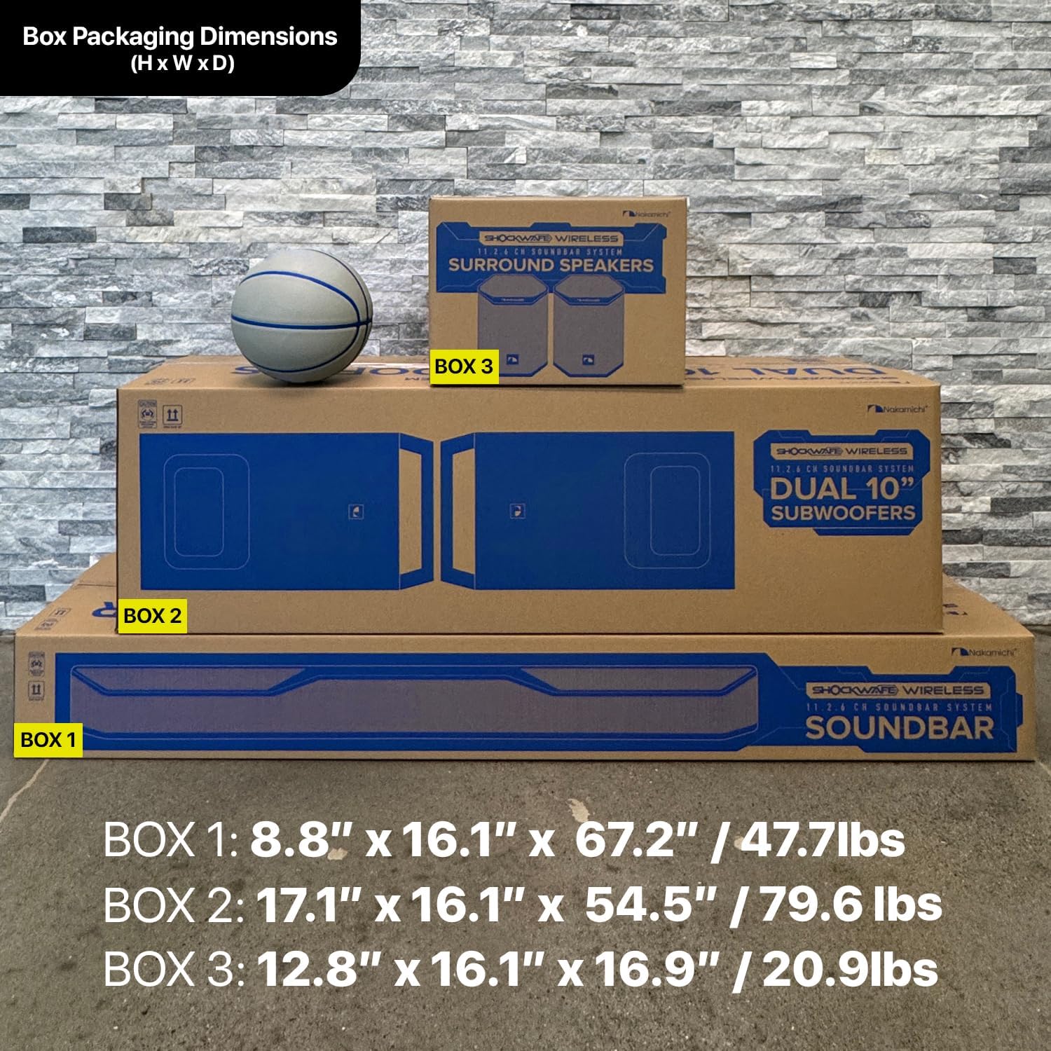 - Product dimensions: Soundbar: 4.5" H x 54.0" W x 9.0" D / 32.5 lbs, Subwoofer (Each): 22.5" H x 12.6" W x 12.8" D / 32.7 lbs, Bipolar Surround Speaker (Each): 9.9" H x 7.9" W x 7.8" D / 8.3 lbs. SHIPS IN THREE BOXES.