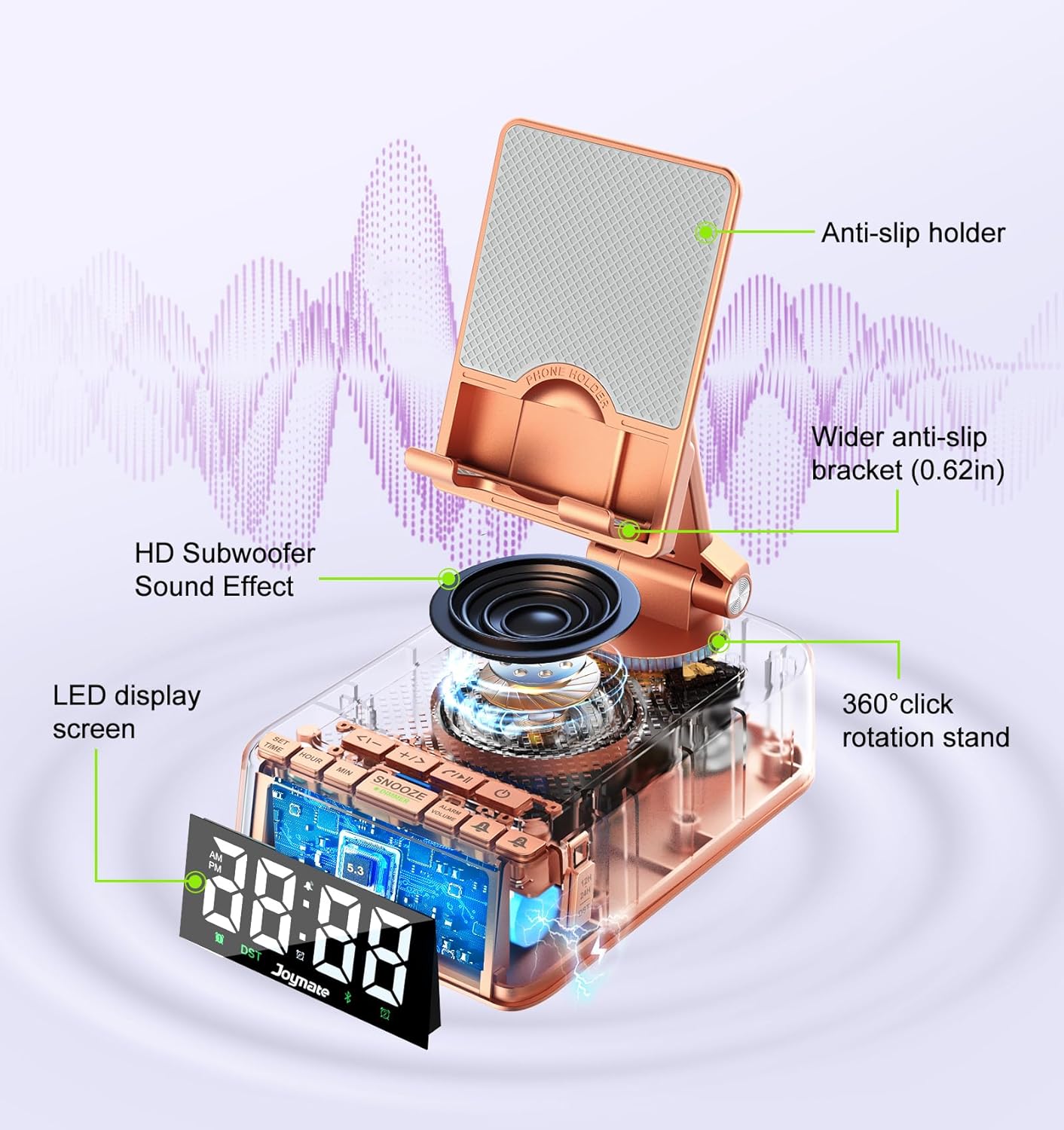 - Bluetooth 5.3 and HD Stereo Subwoofer Speaker- We adopted Bluetooth 5.3 technology to ensure a stable and quick connection with your phone which far range up to 32.8ft. Stereo and subwoofer sound perform well with clear highs and bass with less distortion, well immerse yourself in the plot or music. (Please note: it is not a charging stand.)