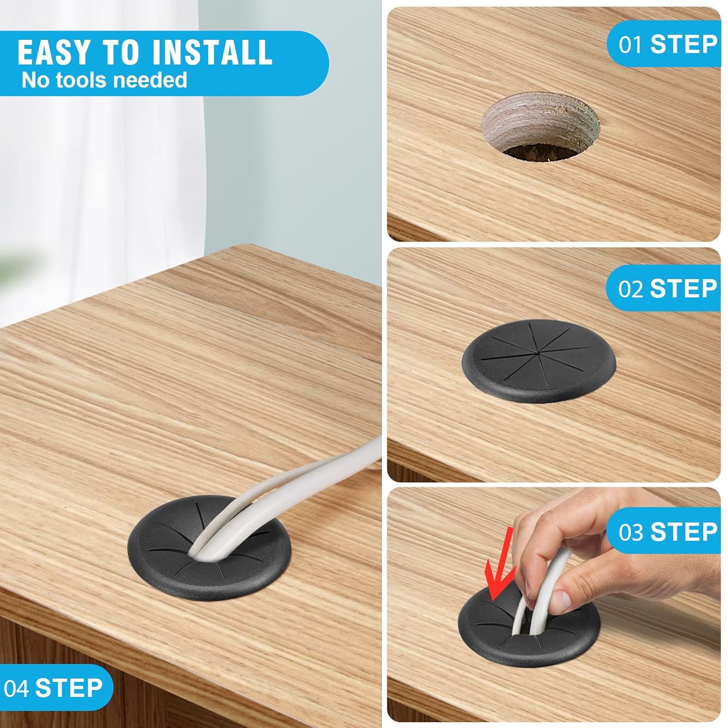 - DELIGHTS PACKAGE -- Your package includes 2 x 2" desk grommets. Useful Tips: ① Make sure the hole's edges are smooth and free of splinters that could damage your cables or the grommet, ② Place the grommet into the hole. It should fit snugly, ③Finally, route your cables through the desk grommet.