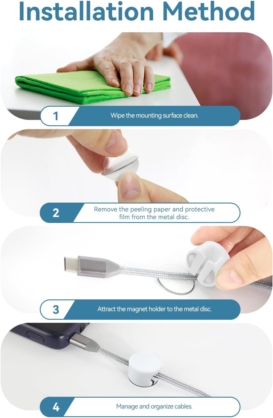 - 【Include Adhesive Plates】 Come with 5pcs silicone wire clips magnet and 5pcs self adhesive metal discs. You can easily attach the magnetic clips directly to metal, iron, or stainless steel surfaces. Alternatively, use a adhesive-backed metal disc we provide to allow the cord clip to adhere to other types of surfaces.