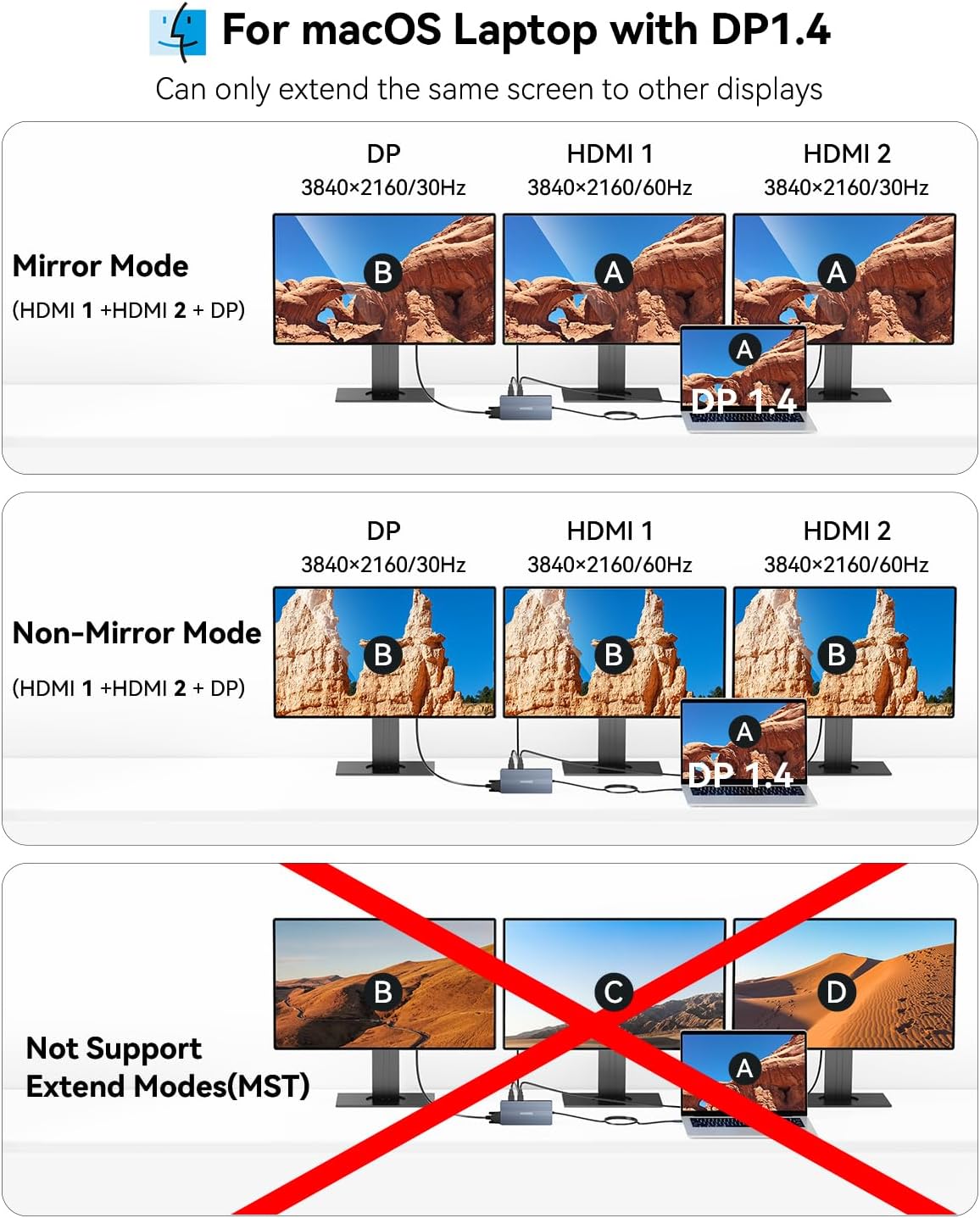 - 4K Dual Monitor & Triple Display: The docking station can easily to achieve dual-monitor and triple-monitor displays for windows. Single use HDMI port up to 4K@60Hz. DP port up to 4K@60Hz (DP1.4). When connect 2 displays, the resolution will be dual 4K@60Hz(DP1.4). Display output will be dual 4K@60Hz + 4K@30Hz when triple display (DP1.4). Note: macOS only supports mirroring mode (SST).