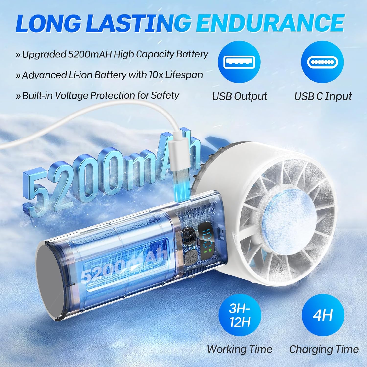 - Compact & Portable with 5200mAh Batteries Power: Personal portable fan measures 7.09 x 2.28 x 2.99 inches and weighing just 0.56lbs, It can be held in hand, placed on a table or this rechargeable small battery travel fan slips effortlessly into bags for on-the-go cooling. The 5200mAh battery lasts 3-12hrs (varies by speed) and fully recharges in 4hrs via USB-C. LED digital display tracks fan speed, you can adjust the wind speed to your preference. Perfect for camping trips, gym sessions, commute or office workdays