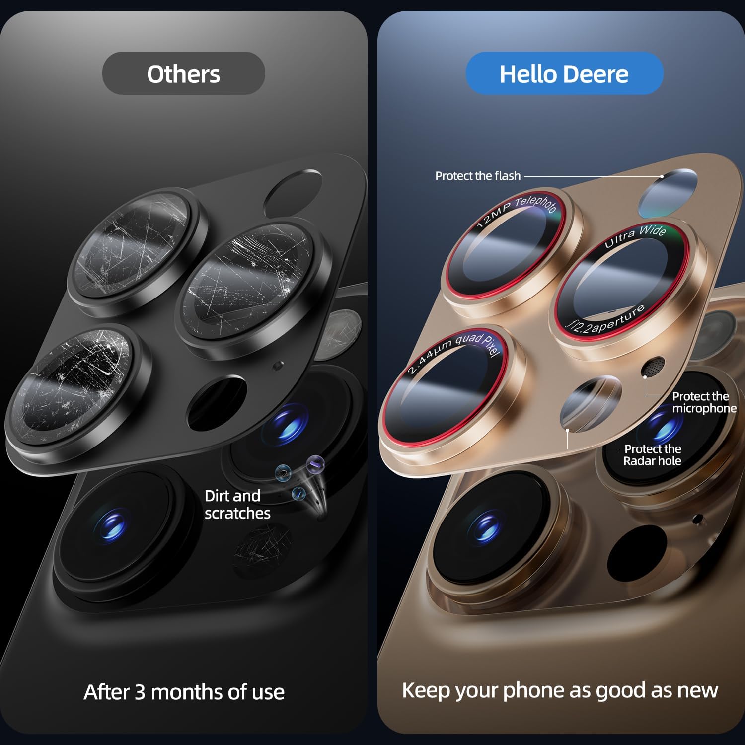 - 【 Military-Grade anti-reflection and anti-scratch】: HelloDeere provides 4x enhanced anti-scratch and anti-drop protection, AR anti-reflection, 1:1 camera model ring and 9H shatterproof tempered glass independent protection design for your iPhone camera lens, providing daily protection for iphone camera lens. The third-generation oleophobic technology can automatically fade fingerprints, isolate oil stains, and keep the lens dry and clean for a long time.
