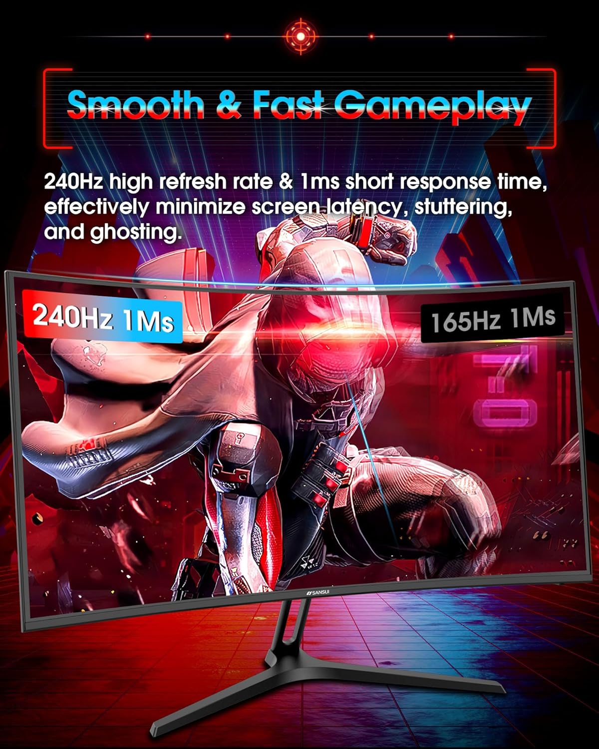 SANSUI 27 Inch Curved 240Hz Gaming Monitor FHD 1080P, 1500R Curve Computer Monitor, 130% sRGB, 4000:1 Contrast, HDR, FreeSync, MPRT 1Ms, Low Blue Light, HDMI DP Ports, Metal Stand, DP Cable Incl.