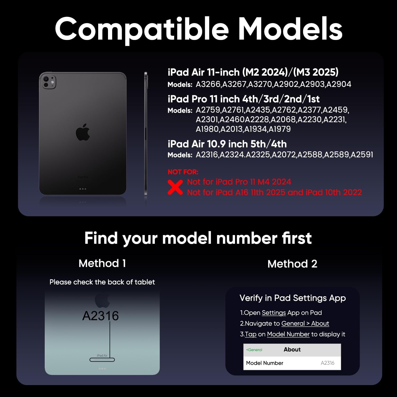- Only Compatible with iPad Air 11-inch (2024 M2)/(2025 M3) & iPad Pro 11-inch 4th/3rd/2nd/1st gen (2018-2022) , iPad Air 5th and 4th gen.Models include 2024 Air 11 inch (A2902, A2903, A2904),2022 Pro 11 4th Gen (A2759,A2435,A2761,A2762), 2021 Pro 11 3rd Gen(A2377,A2301,A2459,A2460), 2020 Pro 11 2nd Gen(A2228, A2068, A2230, A2231), 2018 Pro 11 1st Gen(A1980,A2013,A1934,A1979), 2022 10.9-inch Air 5th Gen(A2588,A2589,A2591),2020 10.9-inch Air 4th Gen (A2072,A2316,A2324,A2325).NOTE:Not fit for iPad pro 11(M4) 2024,We’re happy to help if you need to check compatibility.