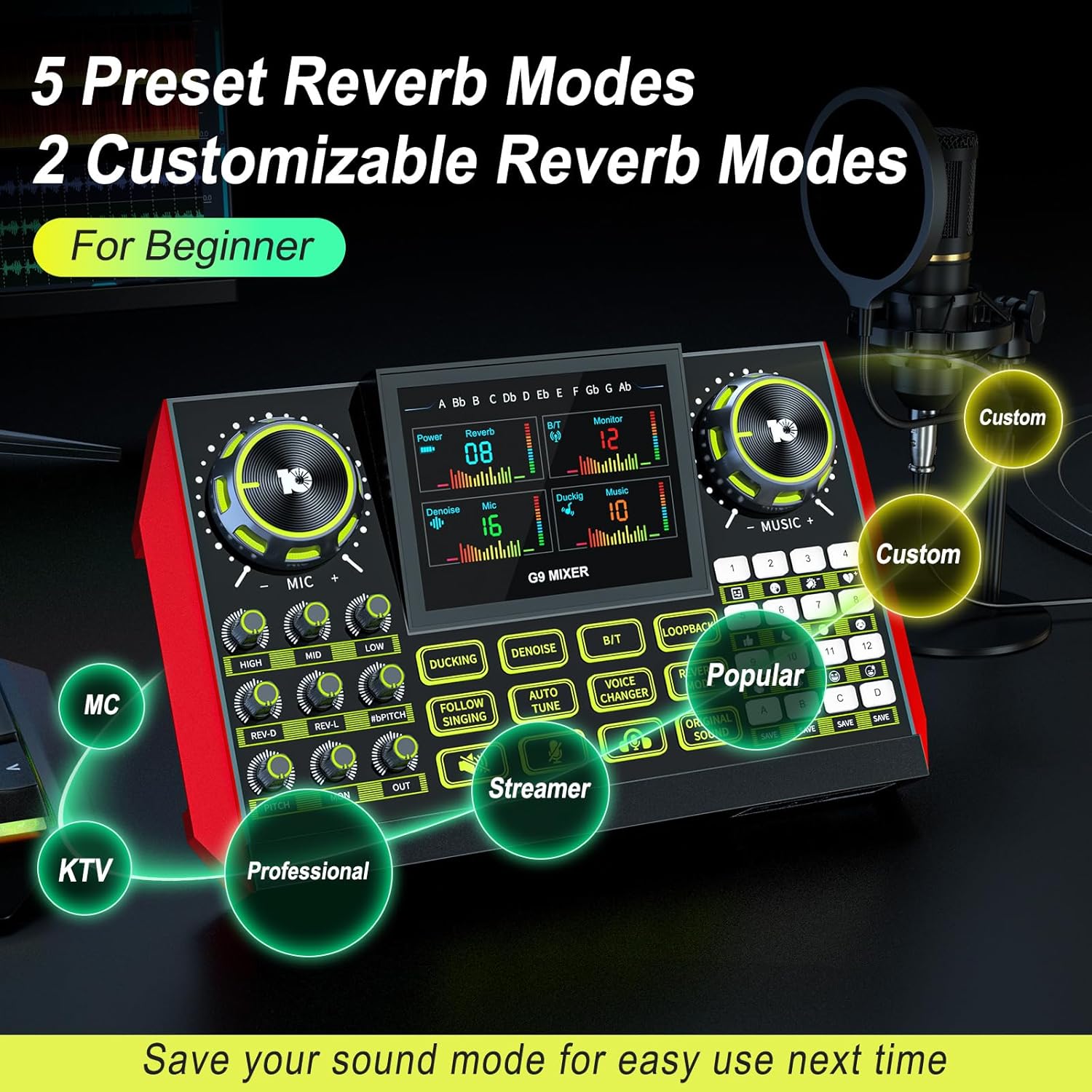 - 【5 Built-in + 2 Custom Reverb Modes, Perfect for Beginners】Whether you’re recording vocals or instruments, live streaming equipment offers 5 preset reverb modes that you can adjust to match your sound. Get a professional audio effect with ease, perfect for live streaming, podcasts, and more.
