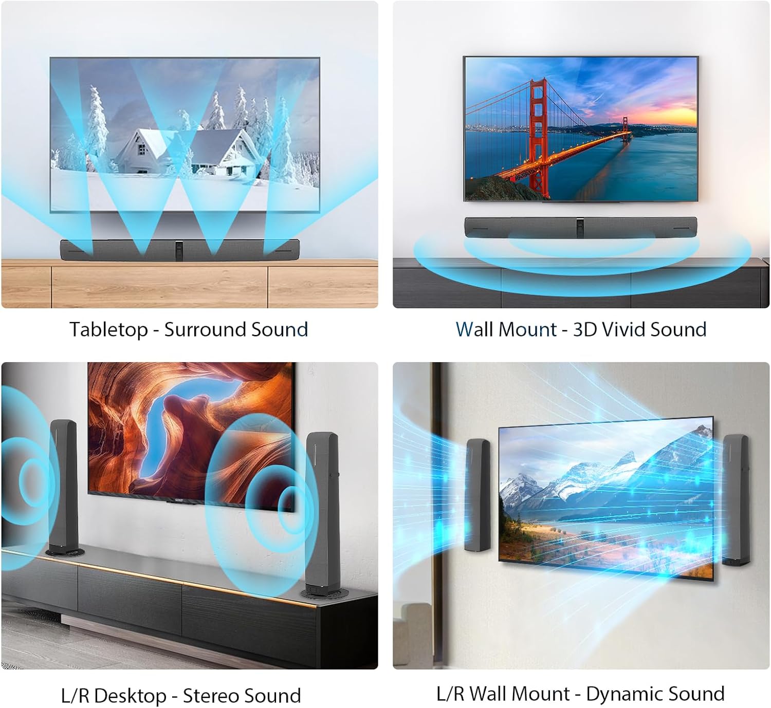 Sound Bar for Smart TV,90W Soundbar with Bluetooth/ARC/Optical/AUX Connect, Auto Volume Boost, 3 Customizable Equalizer Modes, 2 in 1 Detachable Soundbar for TV/PC/Gaming/Projectors