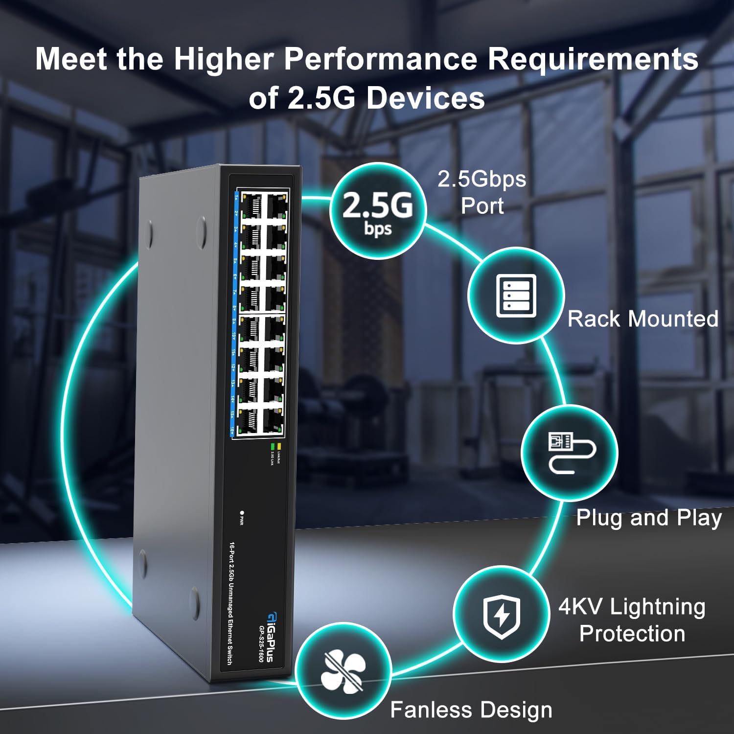 16 Ports 2.5Gb Unmanaged Ethernet Switch, 16*2.5G Base-T Ports. GiGaPlus 2.5Gbps Network Switch for 2.5Gbps NAS/PC, Wireless AP, WiFi6 Router. Plug and Play, Fanless Design.