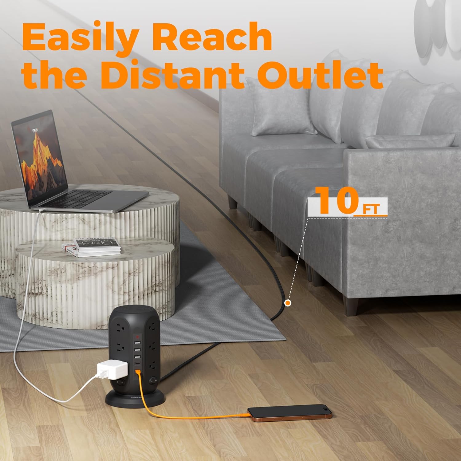 - Flat Plug Extension Cord 10ft: Tower power strip 10ft allows you to reach distant power outlets; The 0.31in ultra thin flat head can be used in tight spaces like behind TV or sofa; The 45 degree right angle design doesn't block the outlet below