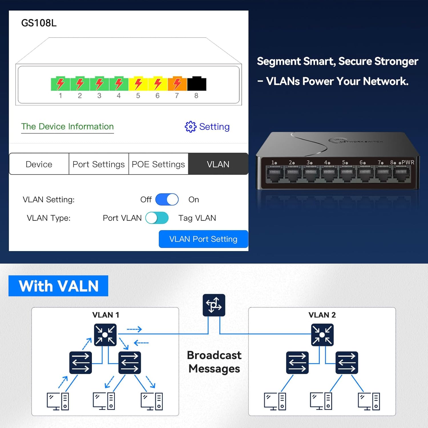 - Enterprise-Level Performance – Faster, More Secure Networking: Unlock enterprise-level capabilities with the STEAMEMO 8-port switch. It offers automatic cable quality detection, precise bandwidth control, QoS, 802.1Q VLAN support, DHCP Snooping, and port mirroring. Boost security with storm control, static MAC addressing, and flow control, ensuring stable, lag-free performance for streaming, gaming, and business applications.