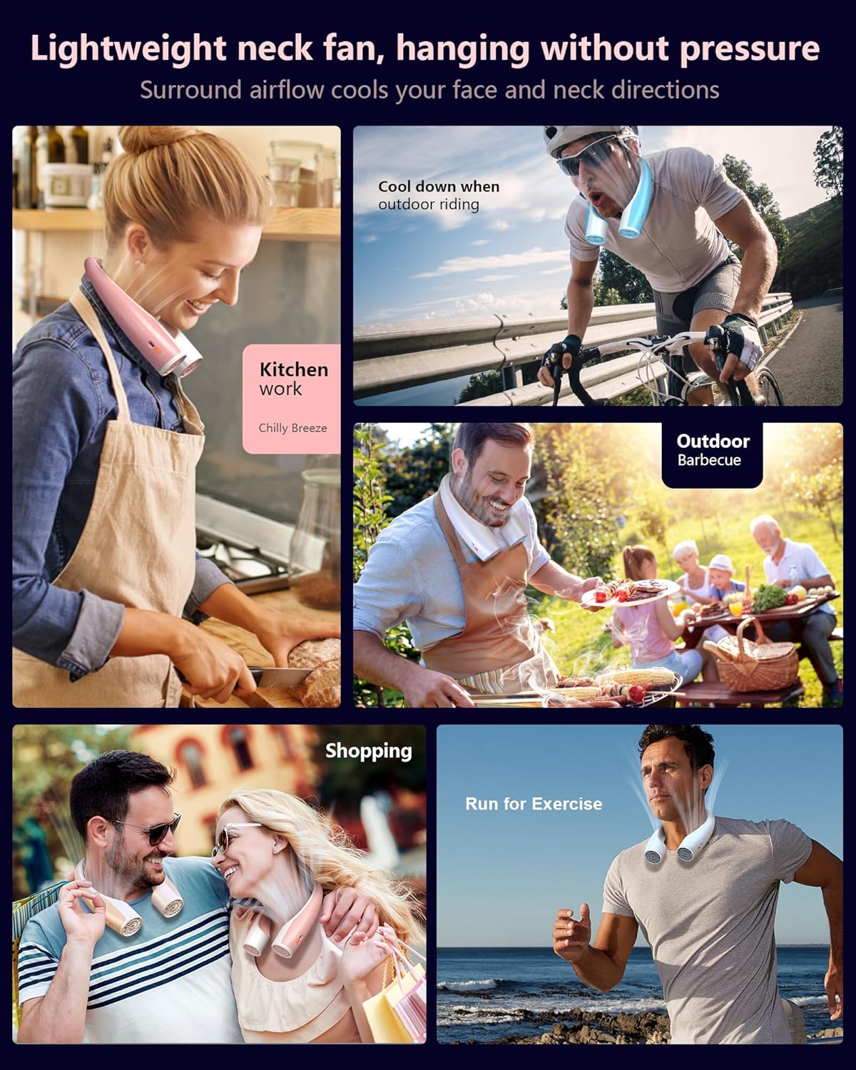 - Next-Gen AI Neck Fan - Experience a superior level of cooling with our upgraded AI portable and wearable fan, featuring two turbine motor fans that provide 360° airflow around your neck and face. The scientifically designed air outlets ensure you can enjoy a refreshing breeze from all angles, keeping you cool even when out in high temperatures.