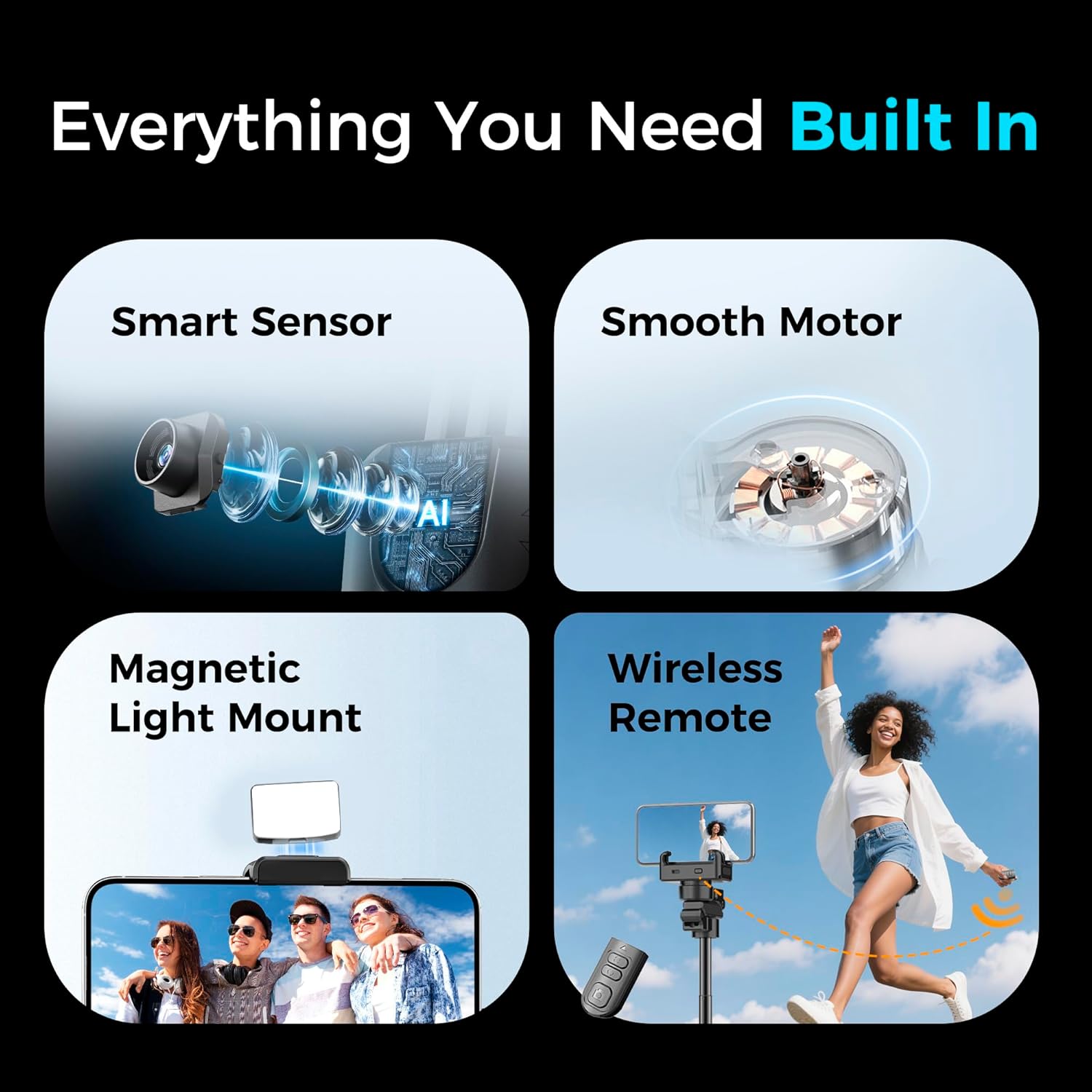 - [All-in-One Tripod, Selfie Stick & Phone Stand] - Use it as a 360° auto-rotating smartphone tripod, handheld selfie stick, or desktop stand. Includes adjustable RGB fill light and wireless remote control. A must-have smart tripod for iPhone and Android.