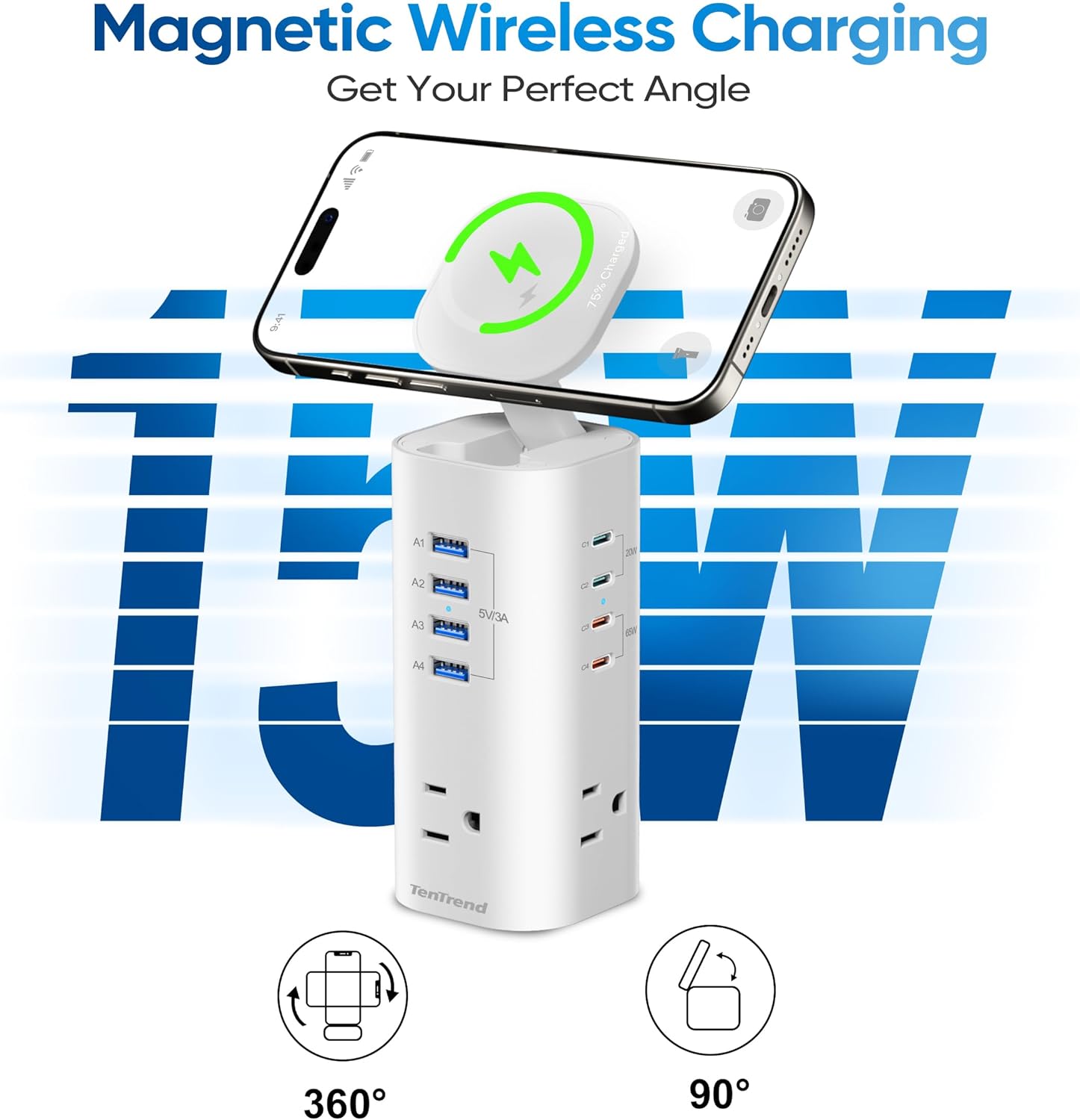 - 【One for All Charging Tower】Equipped with 3 AC Outlets, 4 USB-A ports, 4 USB-C ports (4*Fast charging port) and 1 magnetic charging top, it is a multi-functional charging solution that can charge tablets, cellphones, iphone 14/15 or other devices at the same time.