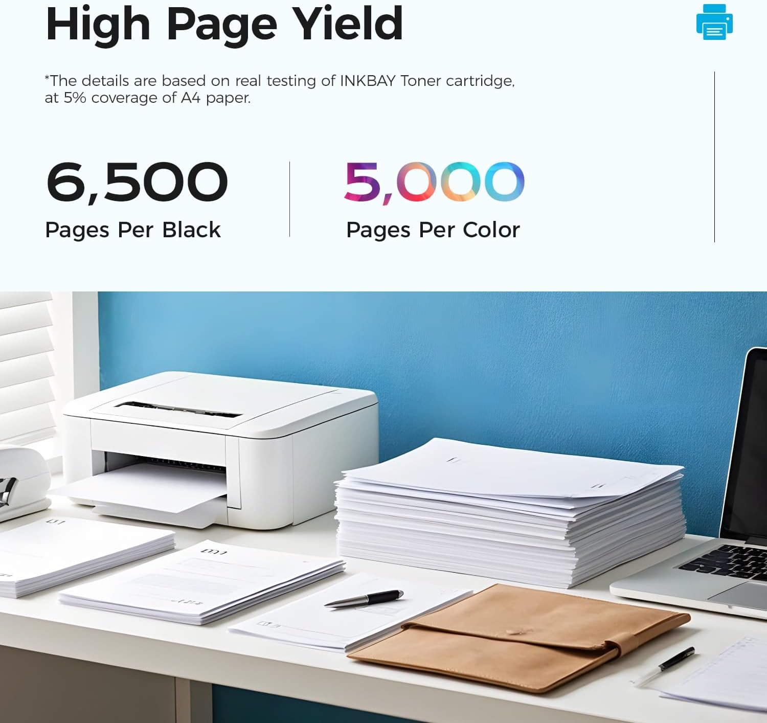 - High Page Yield: Black yields up to 6,500 pages, Cyan/Magenta/Yellow yields up to 5,000 pages each (at 5% coverage of Letter A4)