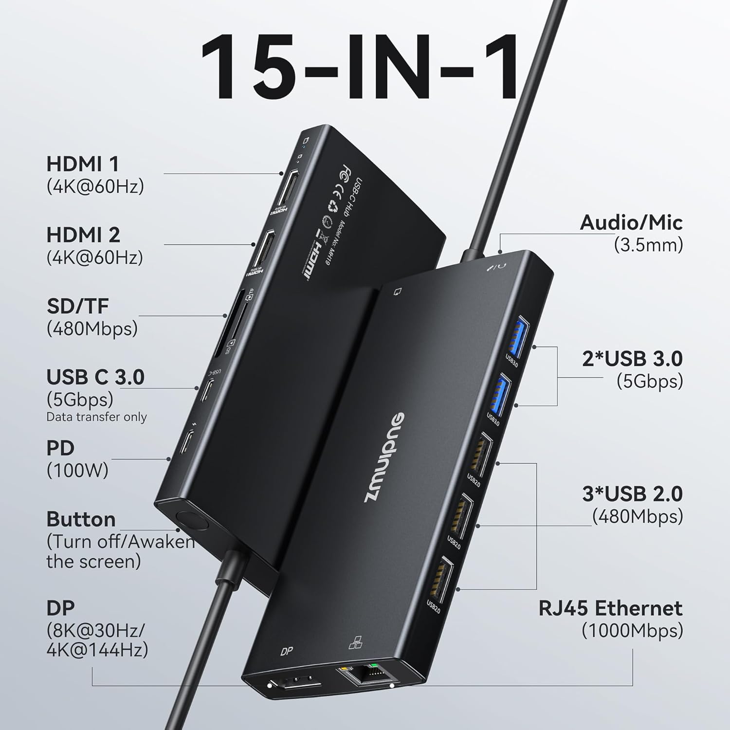 - USB C Docking Station 15 IN 1: With this USB C hub multiple adapter you can easily extend your laptop from one type c/thunderbolt 3 port into 14 ports, you get 2*4K@60Hz HDMI, 8K@30HZ / 4K@144HZ DP, turn off button, compatible and working detection lamp, 3*USB 3.0 ports, USB C 3.0 port, 2*USB 2.0 ports, 100W USB C PD Port, 1Gbps Gigabit Ethernet, SD/Micro SD card readers and 3.5mm Mic/audio. USB C to dual HDMI Adapter widely applicable for Dell XPS13/15, Dell Latitude 13 7000/ E7370, etc